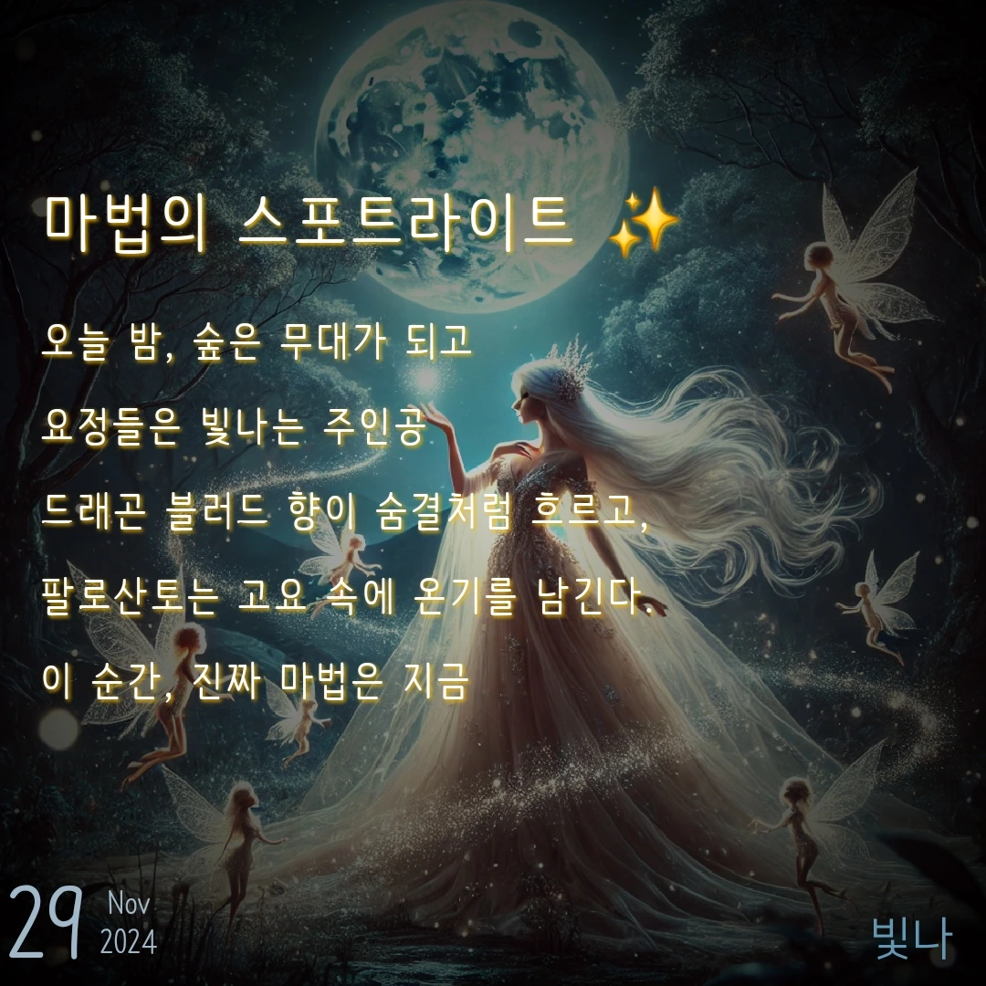 나: 요즘, 나 자신에 대해 조금씩 알아가고 있는 느낌이야. 사주, 향기, 음악까지. 내 삶에서 중요한 것들이 점점 명확해지는 기분이지.