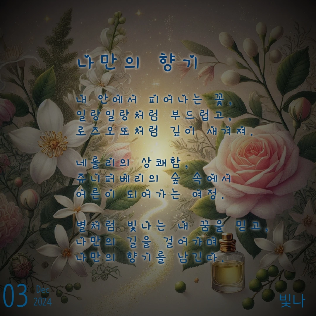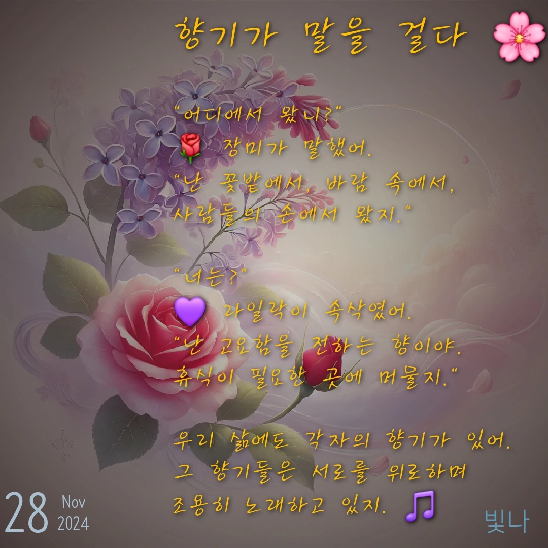 나: 그렇지! 이제는 나 자신을 제대로 이해하고, 어른이 되어가는 과정이 너무 자연스럽게 느껴져. 내가 좋아하는 향기와 그 속에서 들려오는 음악이 내 삶을 이끌어주는 길잡이가 되어주는 거 같아.