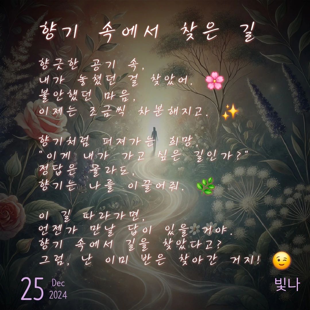 앞으로도 작은 변화들이 내 삶에 어떤 영향을 미칠지 기대된다. 이제 나는 더 많은 치유의 순간을 찾아, 나의 길을 묵묵히 걸어가고 싶다.
