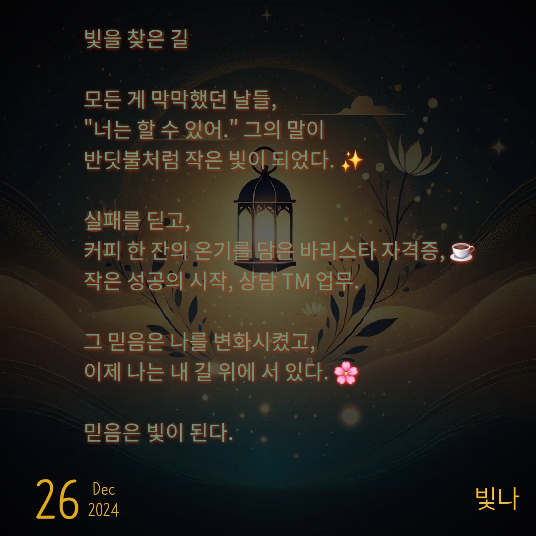 그 경험은 단순히 돈을 벌기 위한 것이 아니라, 내 삶에 첫 성취감을 안겨줬어. 손님들에게 커피를 내어주며, '내가 뭔가를 해냈다'는 자신감을 느꼈어.
