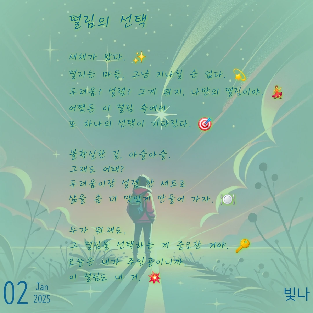 새해가 시작되며, 나는 매일의 선택 속에서 조금씩 자라간다. 설렘과 두려움이 엮인 이 순간, 과거의 떨림을 떠올리며 그 감정을 품고 한 걸음씩 나아가고 있다. 언제나 그렇듯, 진짜 성장은 불안 속에서 일어난다. 그 불안은 결국 나를 더 강하게 만들고, 새로운 길을 선택할 용기를 준다.