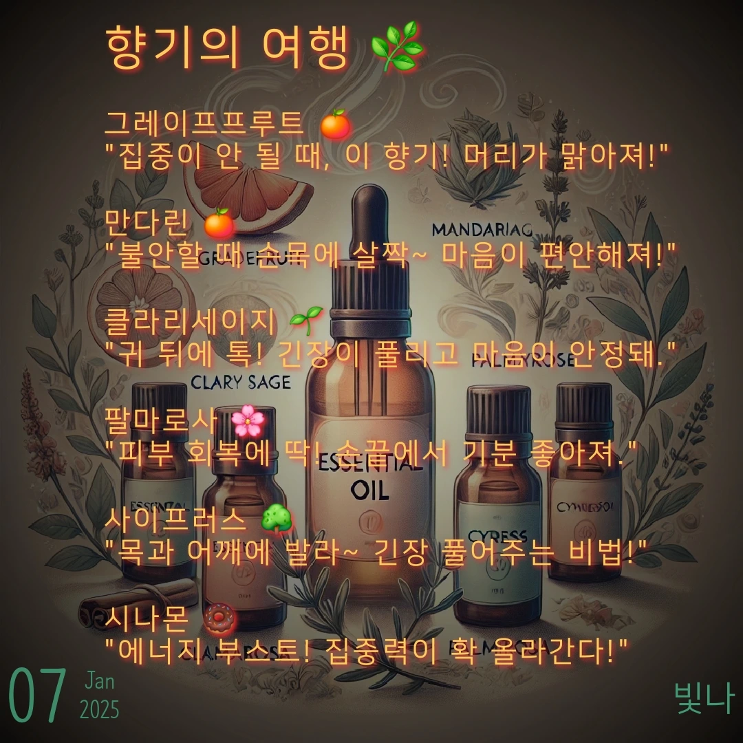 예린: "그리고 클라리세이지는 감정을 차분하게 해 줘. 귀 뒤쪽에 살짝 바르면 긴장이 풀릴 거야."