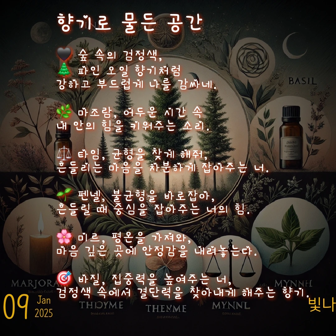 예린: "마조람 오일도 비슷해. 힘든 시간 속에서 내면의 힘을 키워주는 느낌이야. 검은색과 닮은 듯."