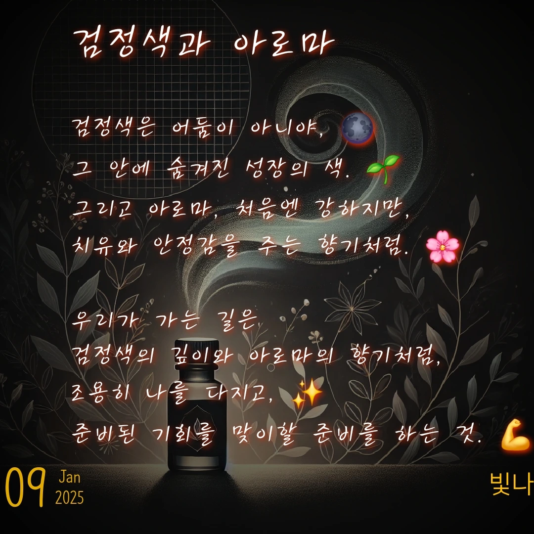 [바쁜 일상 속에서 시험 준비와 에세이 작성이라는 두 가지 과제를 동시에 해내고 있는 8일 기록 중, 벌써 6번째 기록이다. 복잡한 하루 속에서 문득, 검은색과 아로마가 내 삶에서 어떤 의미를 가질지 생각해 보았다. 단순히 어둠이나 향기로만 받아들이기엔 그 안에 더 깊은 치유와 성장이 숨어 있다는 느낌이 들었다.]