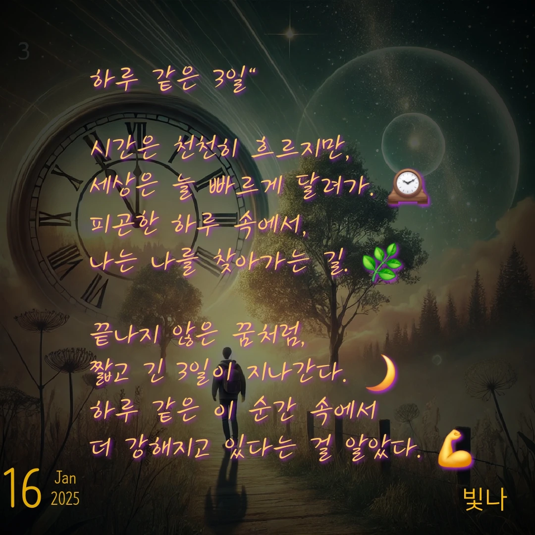 이번 3일은 시간의 속도를 느끼기 어려울 만큼 치열하고도 값진 시간이었다. 시험 준비와 공모전 작업, 그리고 상담에 대한 새로운 관점까지. 피곤했지만, 내 한계를 넘어서며 배운 것들이 많았다. 하루 같은 3일은 내가 조금 더 단단해질 수 있는 계기가 되었다. 앞으로의 나를 기대하며, 이제는 잠시 숨을 고르려 한다.