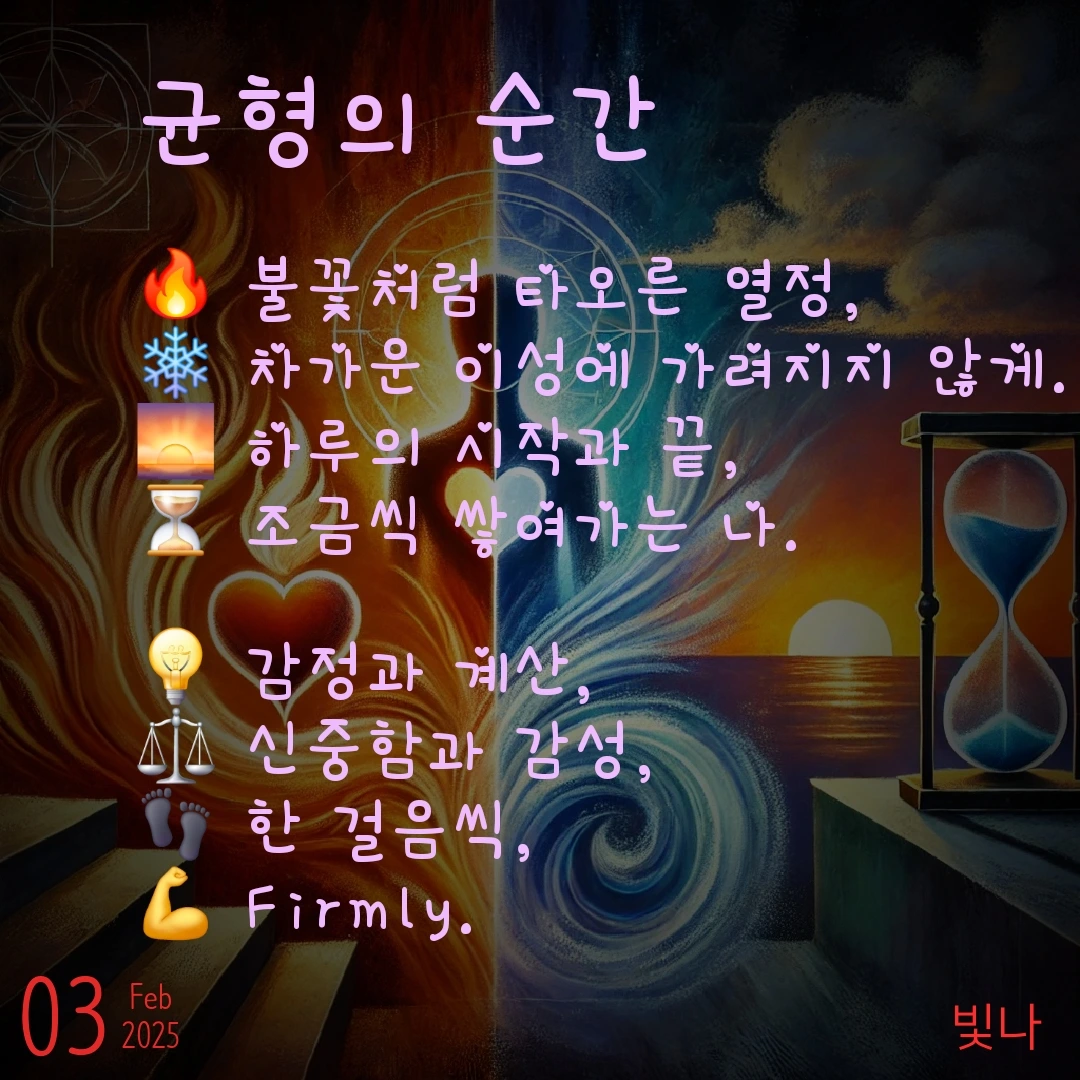 열정과 현실, 신중함과 감성의 균형을 맞추며, 나는 점차 나 자신을 알아가고 있다.