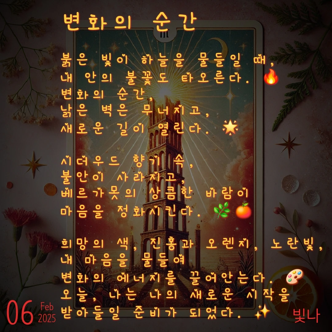 "당신은 중요한 전환점에 서 있다. 시더우드의 안정감을 통해, 내면의 불안이 점차 사라지고 있다. 타워 카드처럼 기존의 것이 무너질 수도 있지만, 죽음 카드가 말하듯, 그 끝은 새로운 시작을 의미한다. 베르가못의 상큼한 향기로 스트레스가 풀리며, 변화의 기회를 받아들이고 성장할 준비가 되어 있다. 이 카드는 변화 속에서 자신을 믿고, 긍정적인 전환을 맞이할 때라는 메시지를 전한다."