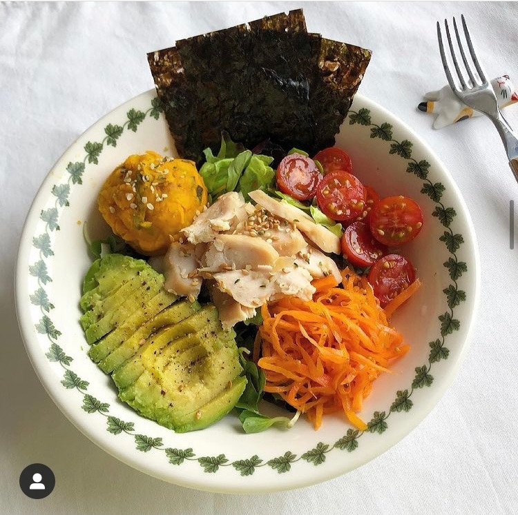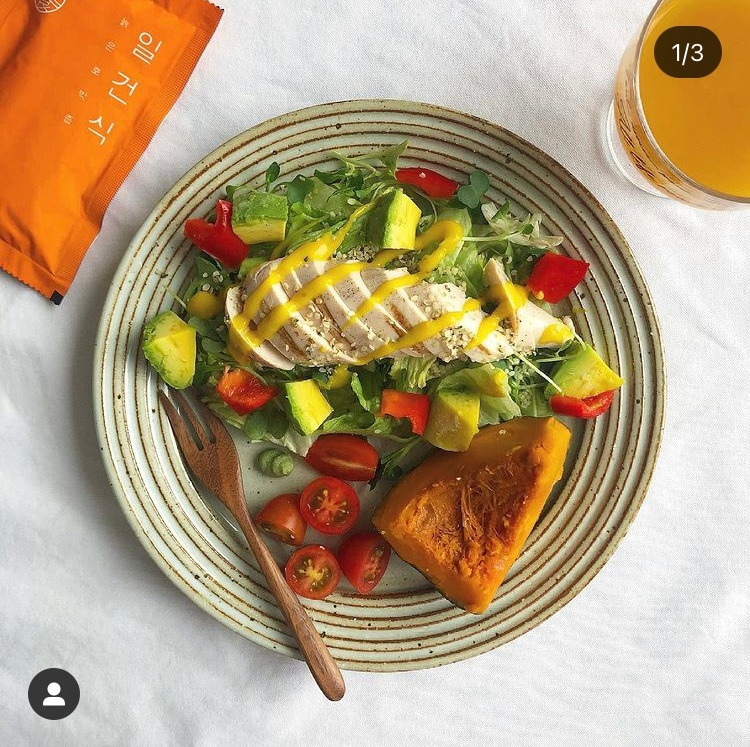 샐러드도 단백질은 닭가슴살, 새우, 연어, 소고기, 템페 등으로, 탄수화물도 고구마 단호박 밥 통밀빵 등 그때그때 먹고 싶은 식자재로 골고루 먹는다