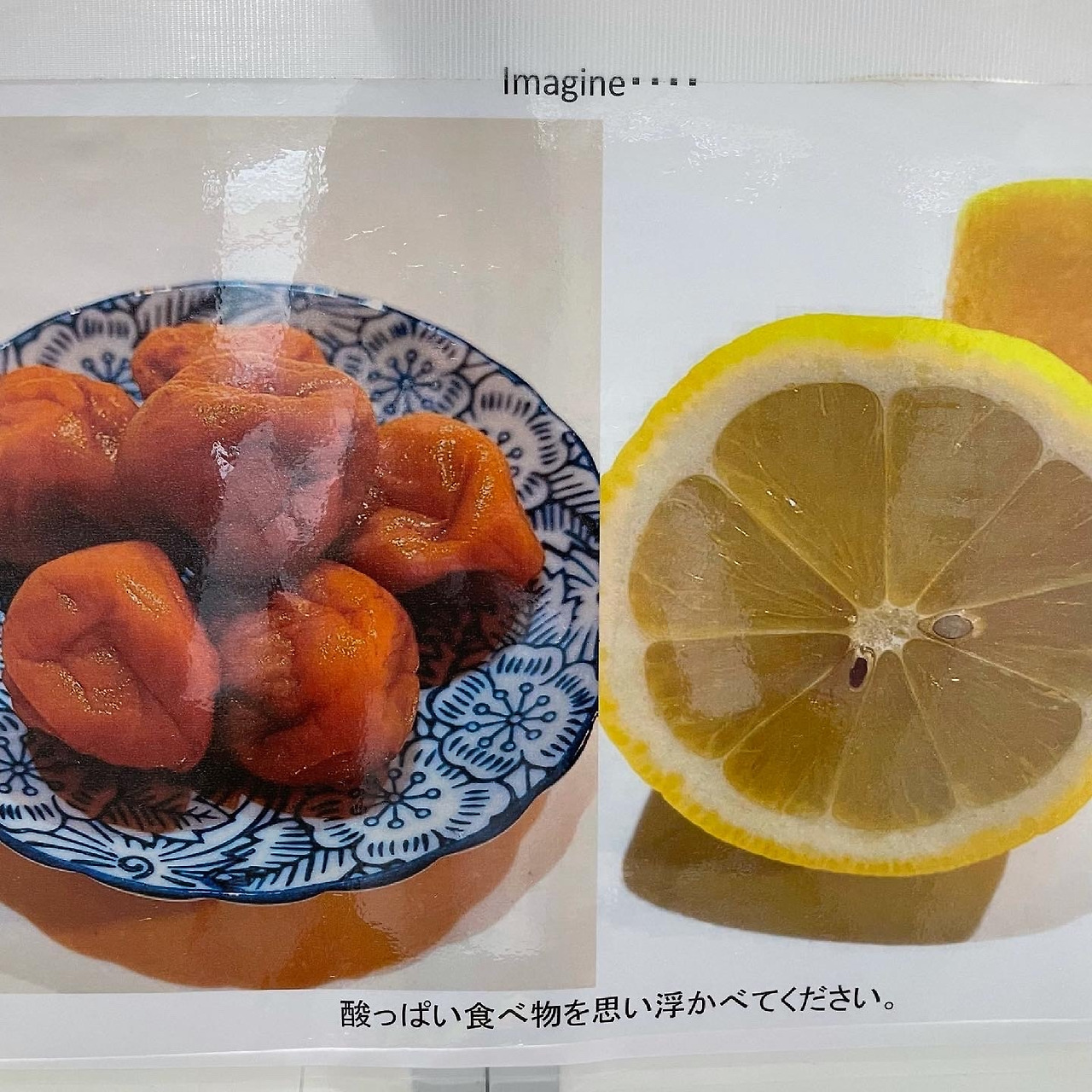 일정량의 침을 뱉어야 하는데 침을 자극하기 위해 우메보시와 레몬 사진을 붙여놨다.