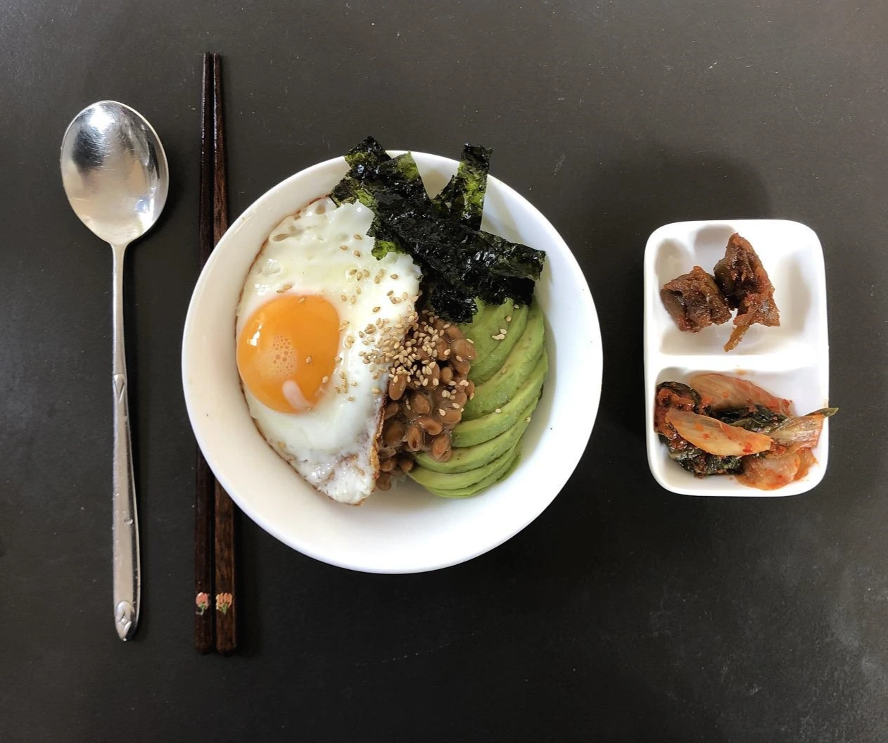 계란과 낫또로 건강한 단백질과 아보카도의 지방 나는 현미밥으로 건강한 탄수화물까지 챙겼다.