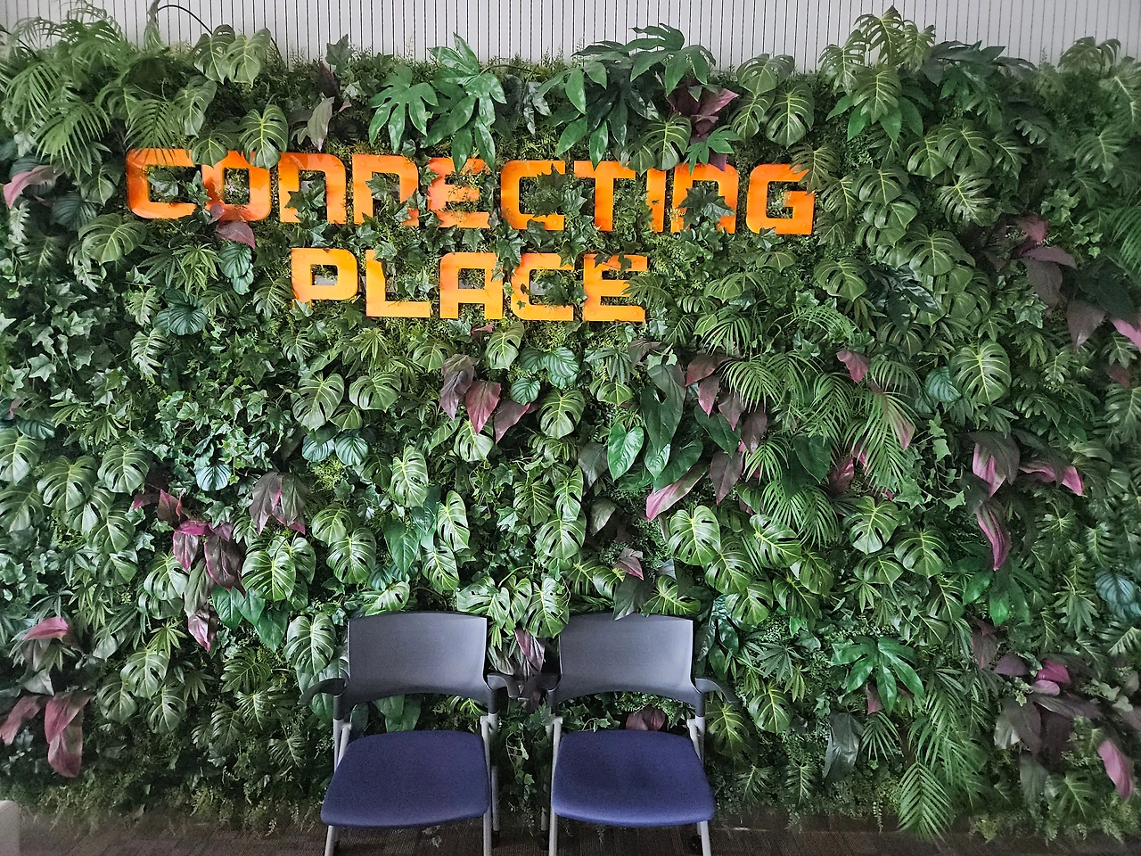 초록빛 #잎사귀로 가득한 벽과 그 위에 새겨진 #CONNECTING PLACE, 그리고 그 앞에 놓여 있는 두 개의 빈 #의자. 단순한 풍경 같지만, 그 안에서 삶에 대한 여러 가지 생각이 피어났습니다.