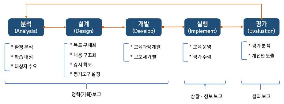 하지만 회사에서 실무를 추진할때는 순서가 좀 다르다. 신입사원에게는 먼저 소소하게 교육과정을 운영하는 일을 먼저 맡길 것이다. 그러면서 업무 경력과 여러 시행 착오를 통해 내공이 쌓이게 될것이고, 전반적이기도 세밀한 평가의 결과를 참고하여 ① 잘되는 것과, ② 안되는 것을 분석하여 개선안을 도출하게 된다. 이렇게 수정과 보완이 필요한 내용들은 차년도의 교육과정을 새롭게 기획하면서 반영을 시킨다.