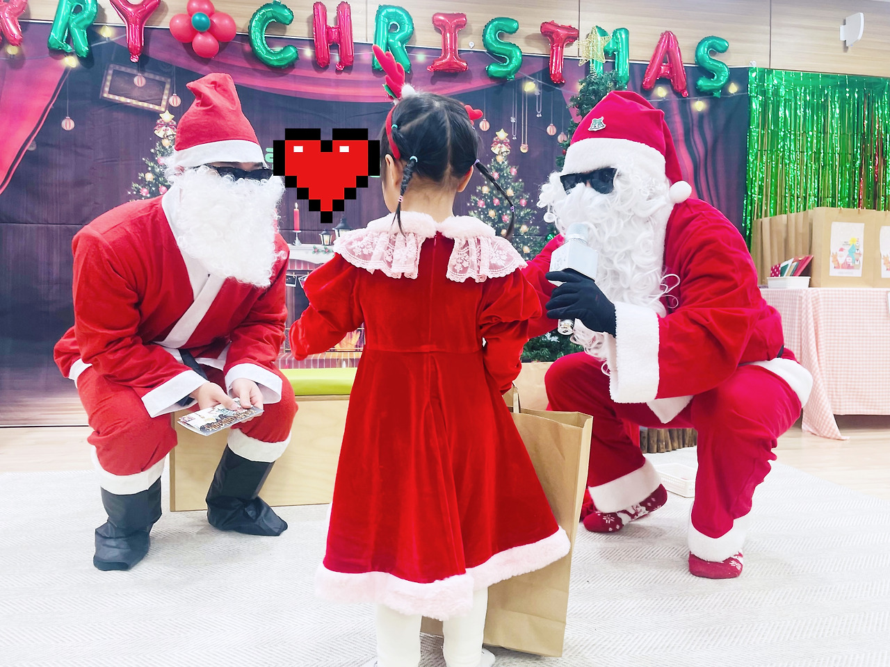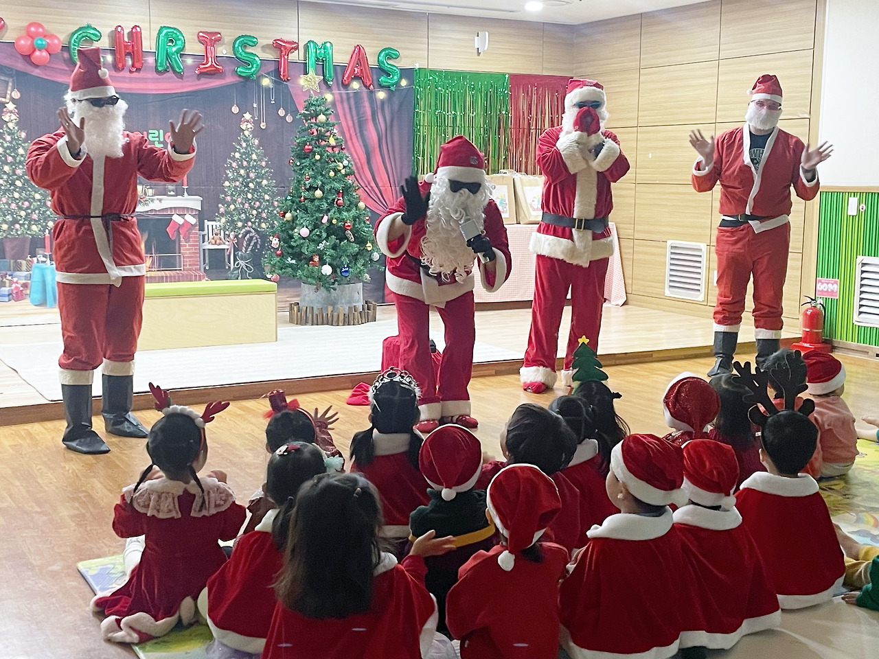 우리들의 걱정은 너무나 기우였다. 강담 구석 숨겨진 방에서 나와 이미 옹기종기 모여있는 어린이집 아이들 앞에 나타났을 때, 체육선생님은 완전한 산타할아버지가 되어 있었다. 아이들이 깜박 속아 넘어갈 만큼 완벽했다. 심지어 세 살 아이들은 산타할아버지 네 명이 우르르 나타나자 무서워하며 울기까지 했다. 우리 아이가 있는 네 살반 아이들은 신기한 듯 멍하니 쳐다보기만 했고, 다섯 살과 여섯 살반 아이들은 신나서 우리에게 손을 내밀었고, 캐럴 음악에 맞춰 춤도 추었다.