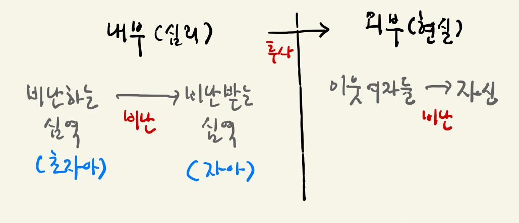 그런데 왜 이런 자리 바뀜이 일어난 것일까? 심리 내부적으로 내려진 심판은 받아들이지 않을 수 없지만, 밖으로부터 오는 것은 거부할 수 있다. 우리 심리는 <비난하는 심역>인 초자아와 <비난 받는 심역>인 자아로 나뉘어져 있다. 초자아가 자아를 비난하자 우리 내부에서 벌어지는 일이므로 피할 수가 없다. 그래서 그것을 밖으로 내보내어 남들이 나를 비난한다는 망상을 만든다. 그것이 관찰 망상과 피해 망상이다. 그런 식으로 심판과 비난은 그녀의 자아로부터 멀리 떨어져 유지된다.
