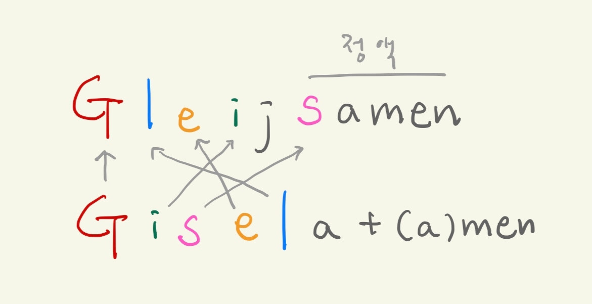 그런데 놀랍게도 프로이트가 이것을 해석해낸다. 쥐인간의 애인의 이름이 지젤라(Gisela)인데 거기에 정액(Samen)을 붙인 것이라고 말이다. Glejisa는 Gisela(지젤라)의 철자를 바꾸기한 것, 즉 아나그램(anagram)이다. 예를 들어, 프랑스어로 사랑하다는 에메(aimer)인데 이것의 철자의 자리를 바꾸기 하면 성모 마리아(Marie)가 된다. 지젤라(Gisela)의 철자를 바꾸기 하고, 애인의 이름에 있는 s를 amen 앞에 붙여서 정액(Samen)을 만들어 붙이면 글레이자멘(Glejisamen)이 된다. 말하자면, 쥐인간은 언어로 애인과 수음을 한 것이다.