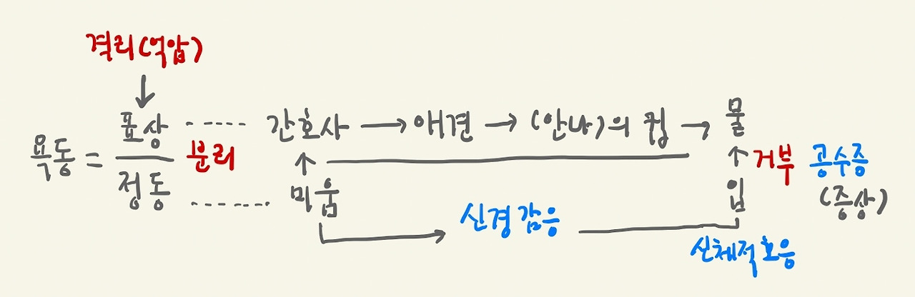 좀더 정확하게 말하자면 격리(억압)되는 것은 증오심이라는 정동이 아니라 간호사라는 ‘표상’이다. ‘간호사’라는 ‘표상’에 ‘증오심’이라는 ‘정동’이 붙어 있는데 표상과 정동을 합친 것이 ‘욕동’Trieb이다. 욕동을 구성하고 있는 표상이 격리(억압)되면 거기에 붙어 있던 정동이 떨어져 나간다. 떨어져 나간 정동은 신경 감응(innervation)에 사용된다. 신경 감응이란 에너지가 신경의 경로를 따라 전달되는 것이다. 신경 감응된 정동은 육체의 특정 부위에서 탈출구를 찾는데 그것이 신체적 호응(somatic compliance)이다. 안나 O의 경우, 정동이 육체를 따라 흐르다가 입에서 탈출구를 찾으면서 물을 거부한 것이다. <히스테리증자는 말로 할 수 없기 때문에 증상으로 말한다.>