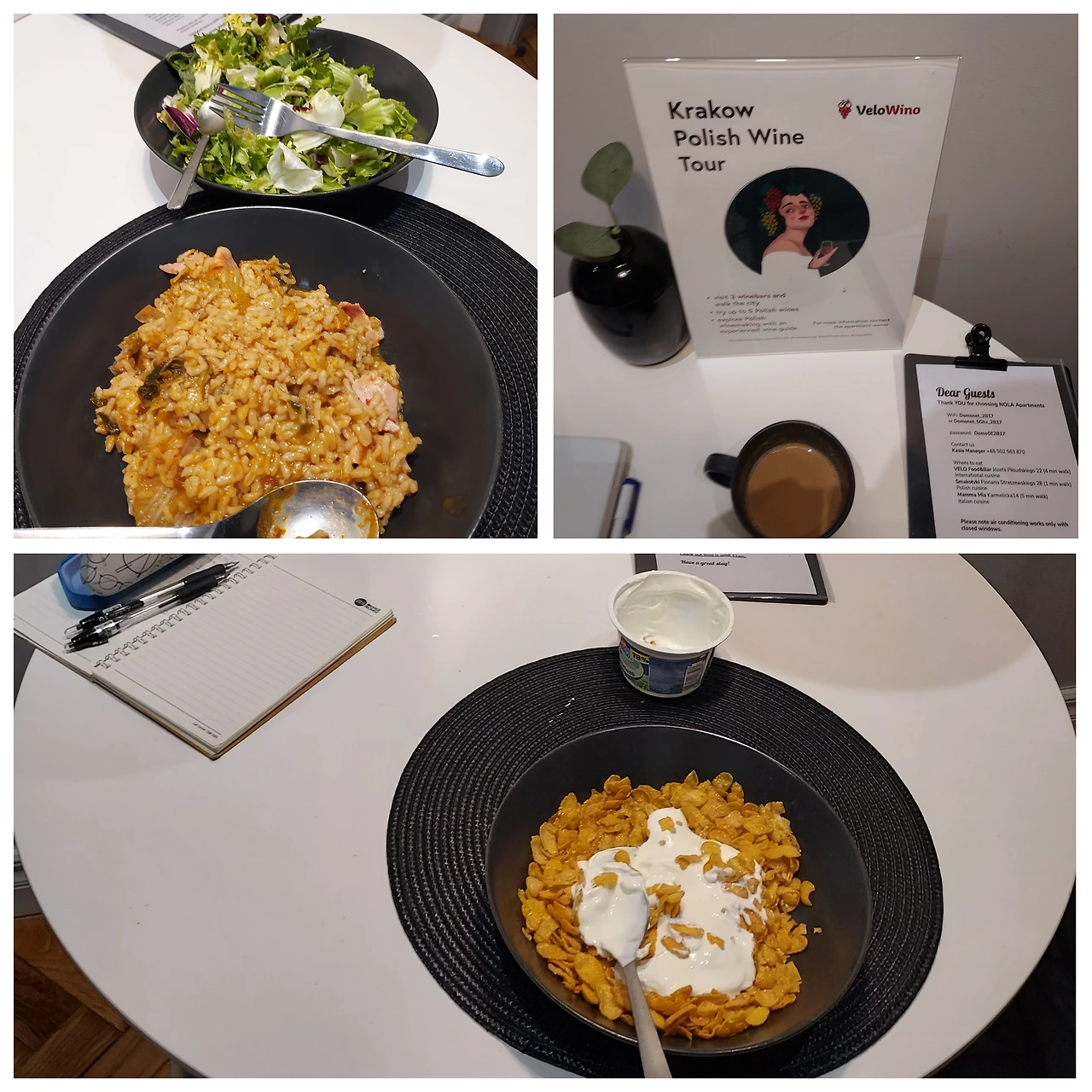 여행지 아침식사에 빠뜨릴 수 없는 플레이크와 요구르트, 김치와 햄이 들어간 필라프.