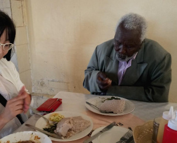 활동지를 찾아 아침 일찍 집을 나섰다. 켄의 집에 들러 그의 사무실 겸 방을 구경하고 함께 길을 나선 사람들과 밥을 먹기 위해 식당으로 향했다. 여기서는 '호텔'이라고 부르는 곳이 식사를 할 수 있는 카페를 의미한다. 집에서 먹는 식단과 다를 것이 없는 메뉴. 치킨을 시키면 커다랗고 질긴 닭다리 하나가, 쇠고기를 시켜도 질겨서 잘 안 씹히는 냄새나는 고기가 우갈리, 케일 볶음과 함께 플레이팅 되어서 나온다. 밥 먹기 전에 손을 씻고 우갈리를 손으로 꾹꾹 주물러서 야채볶음과 고기를 곁들여 먹는다. 숟가락과 포크가 별로 필요 없는 식사 방법이다.
