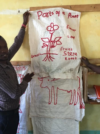 앞으로 4주 정도 봉사활동을 하게 될 우모자 고아원의 스터디룸. 곡식 마대에 빨간색실 스티치로 교구를 만들어 걸어둔 것이 인상적이었다.