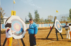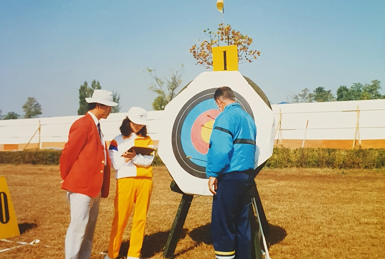 화살이 꽂힌 과녁의 점수를 심판과 확인하며 점수판에 적어서 휠체어에 앉아서 과녁을 향해 활을 쏜 선수들에게 달려가 보여주고 사인을 받았다.