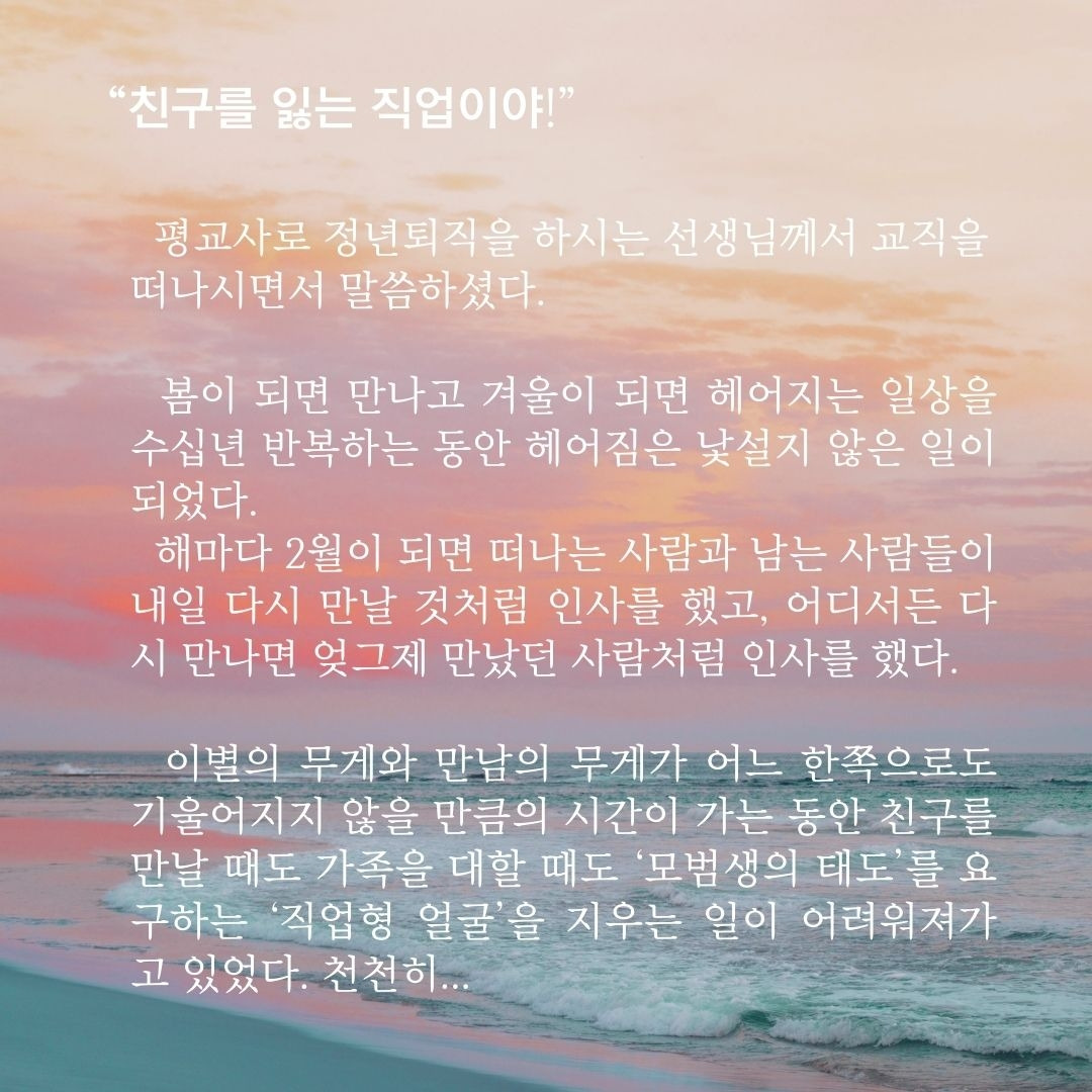 명예퇴직을 하고 나서 시간강사와 기간제교사로 여러 차례, 여러 날, 여러 아이들을 다시 만났다. 짧은 기간 동안 심한 부적응행동으로 어려움을 겪고 있는 아이들의 행동을 분석하고 조언도 하며 밀도 있는 행동지원을 하나 둘 수행할 때마다 지난 삼십 년의 시간을 헛되이 보내지 않았다는 확인 도장을 받는 듯한 작은 기쁨이 있었다.