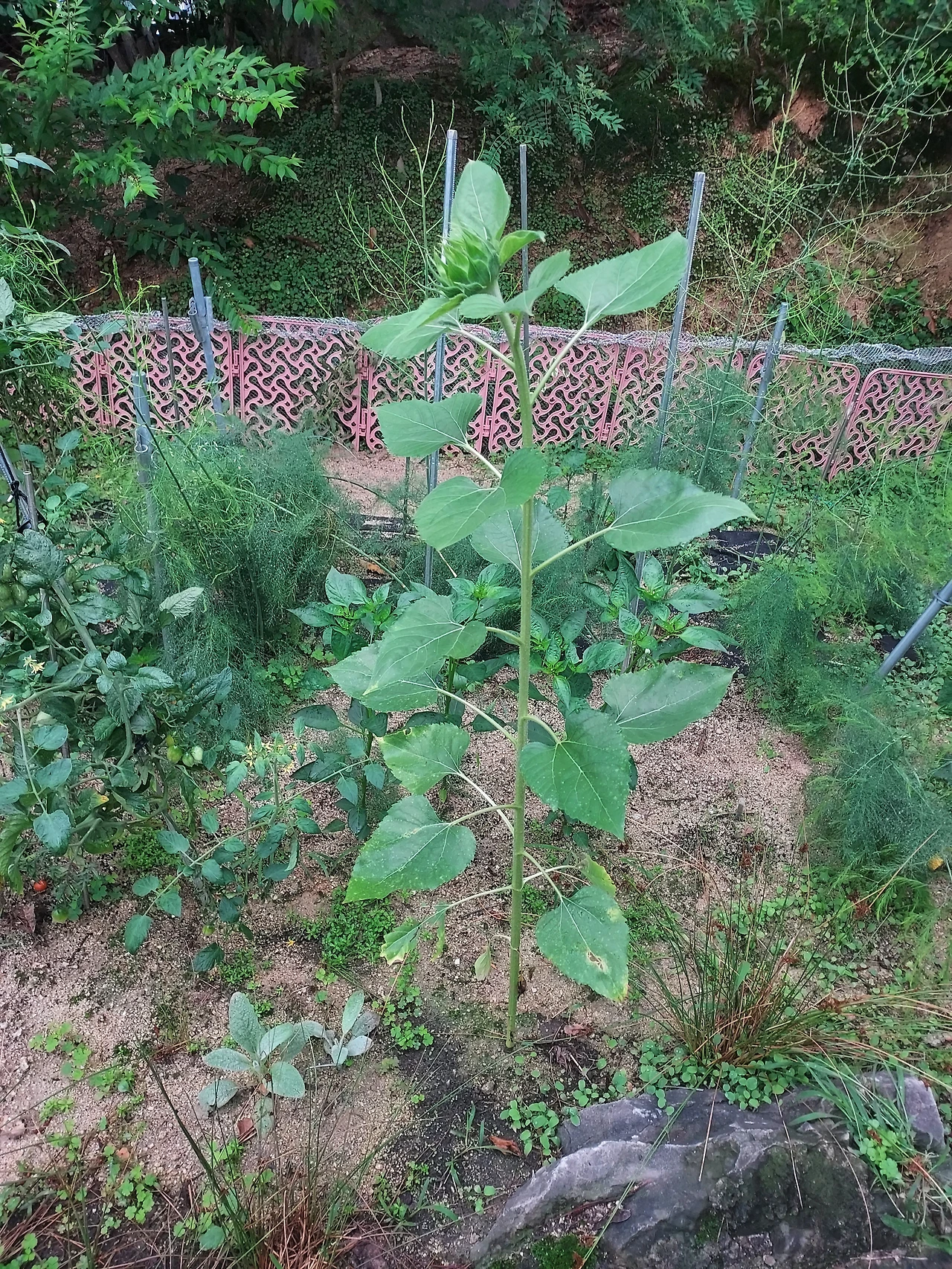 내가 심은 것도 아니고, 어딘가에서바람을 타고 날아오기에도 제법 무게감 있는 씨앗을 가진 이 아이의 등장은 의문투성이다. 고양이 사료를 챙겨 먹던 새가 남기고 간 흔적일지도 모르겠지만 수레국화를 기다리던 그 자리에서 하루가 다르게 키를 올리고는 동쪽으로 얼굴을 고정시킨 채 우뚝 선 모양으로 해를 받는다.