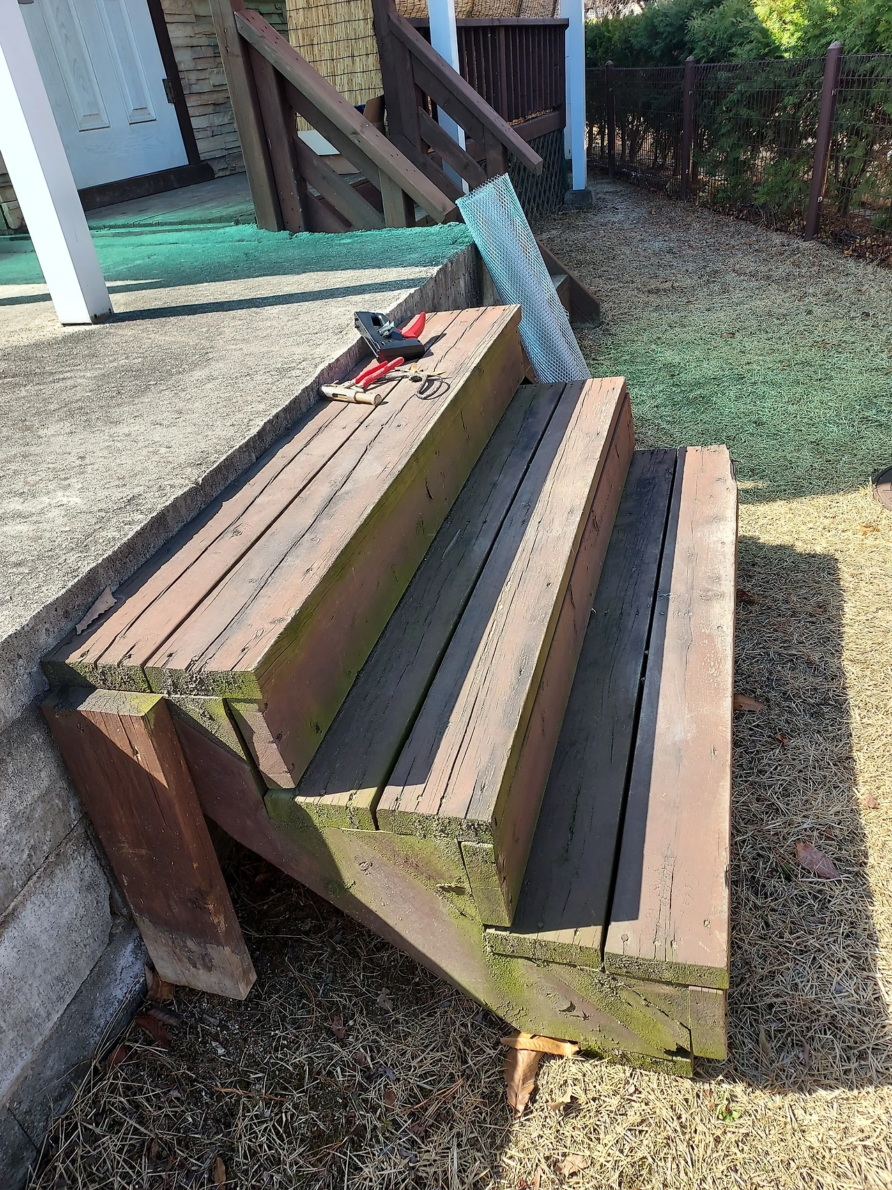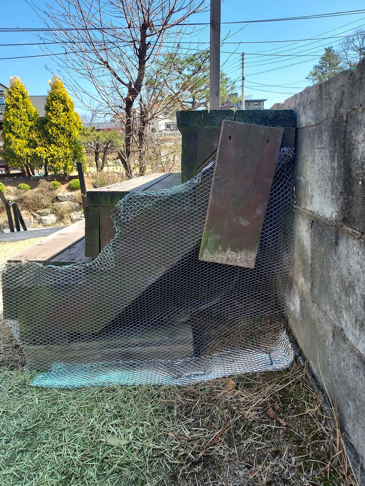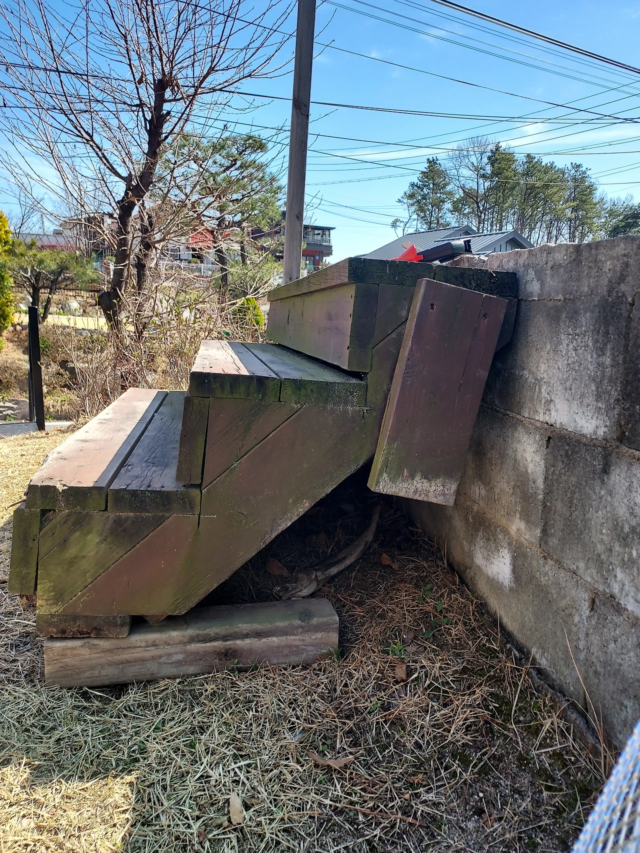 앞마당과 뒷마당을 오가며 낙엽을 치우다 작년 가을 철제 계단을 새로 만들고 뜰에 올려 둔 원목계단 밑의 낙엽도 거둬내야겠다 싶어서 계단 밑을 보다가 소스라치게 놀랐다.