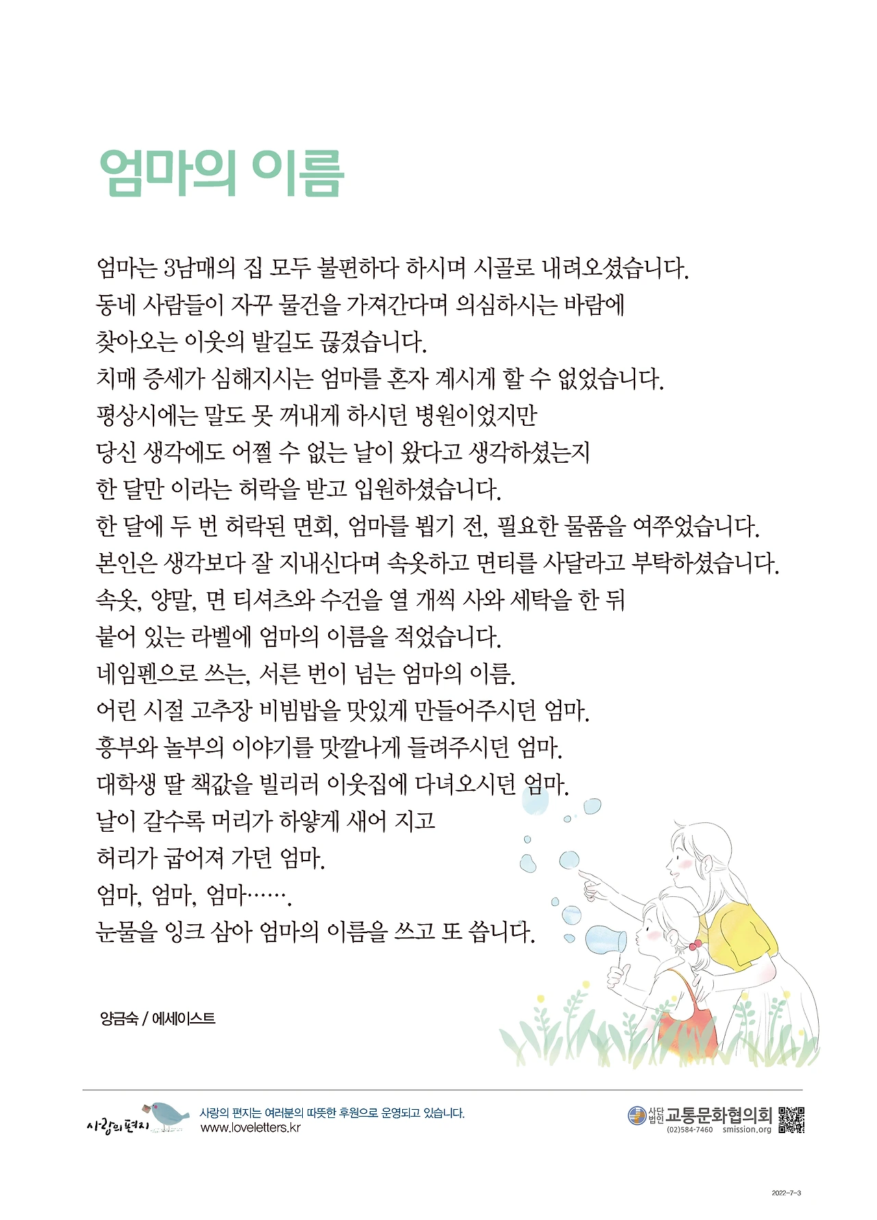 작년 6월 치매로 인해 요양병원에 입원하신 엄마를 그리워하며 쓴 '엄마의 이름'을 지하철 사랑의 편지 포스터로 제작해 몇 개의 지하철역에 약 보름 정도 설치해도 되는지 묻는 제안이었다.