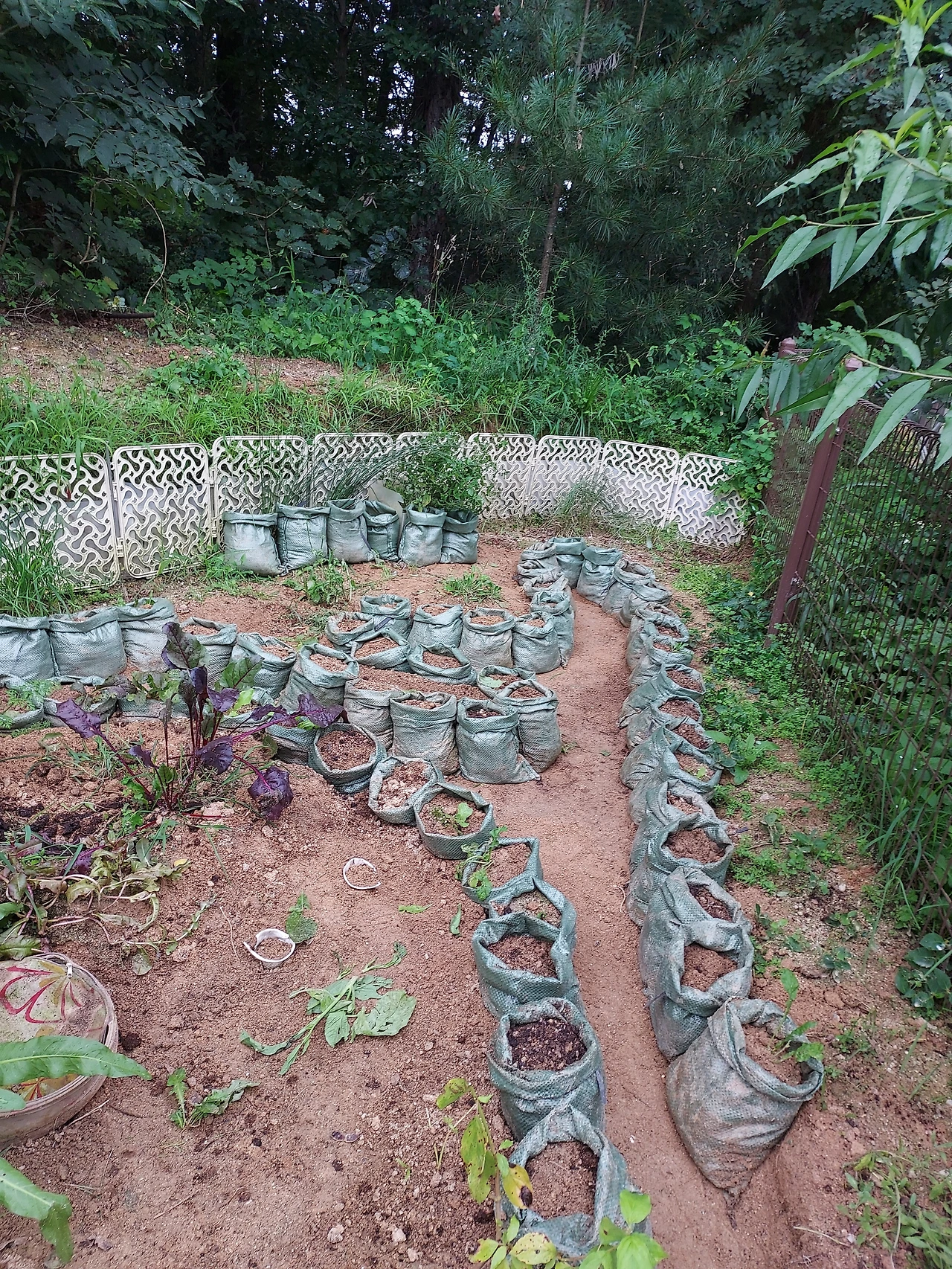 모래마대에 흙과 거름을 담아 밭 가장자리를 둘러가며 텃밭을 만들고 있는 중이다.