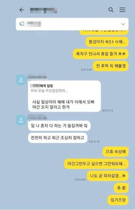 같은 공장에서 일하는 그는 안전하게 퇴근하라며 메시지를 보냈고 오늘 마지막 휴식 시간에 안 나왔냐고 다정하게 물었다.