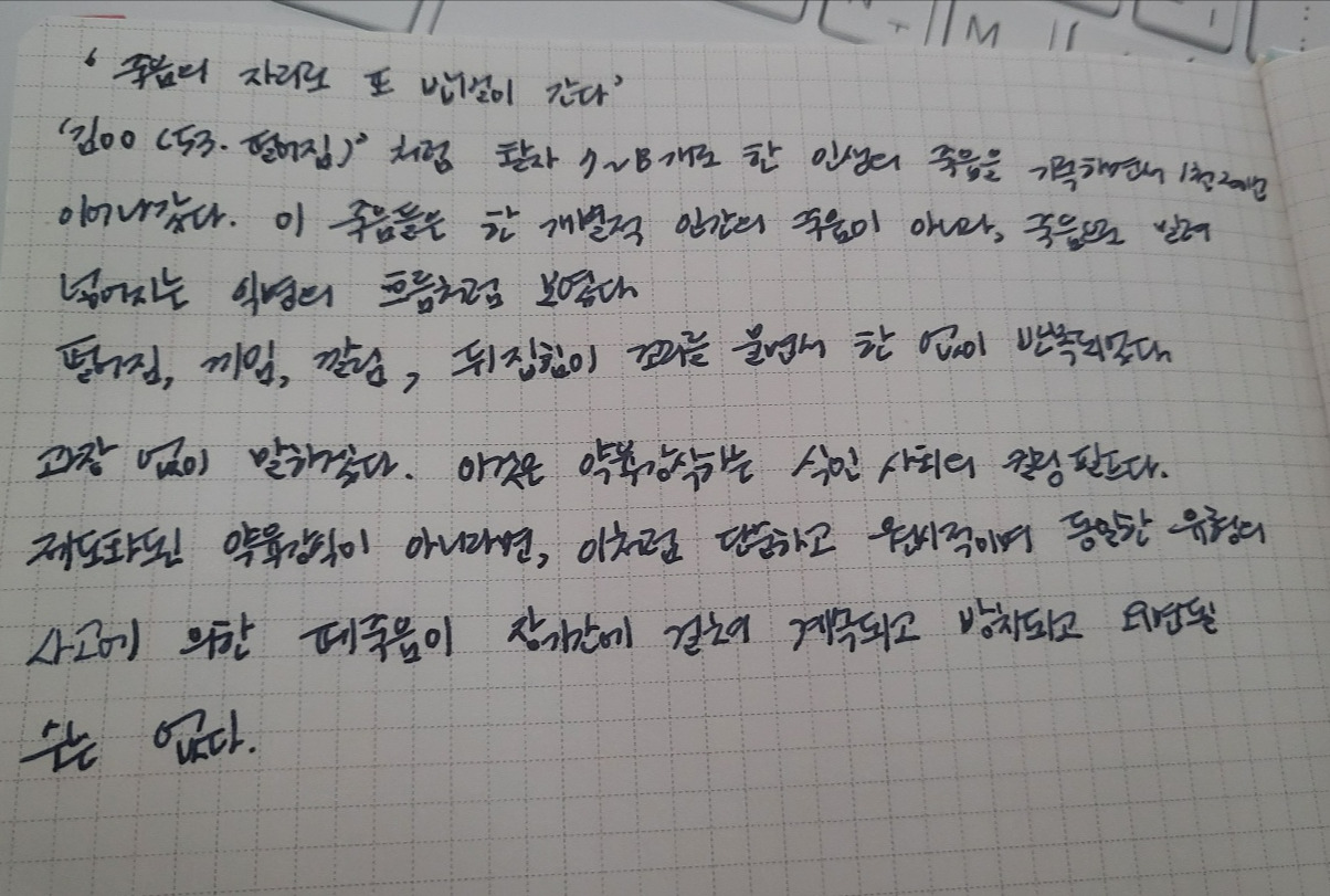 똑같은 자리에서 똑같은 방식으로 떼죽음하는 이 킬링필드에서 이윤의 집중과 책임의 소멸이 구성되고 작동되는 방식을 모르는 사람은 없다. 수많은 일류 논객들이 명석한 분석력과 날선 문장으로 그 문제점을 규명하고 개선책을 제시해서 더 이상의 언설은 이미 필요 없어 보인다.