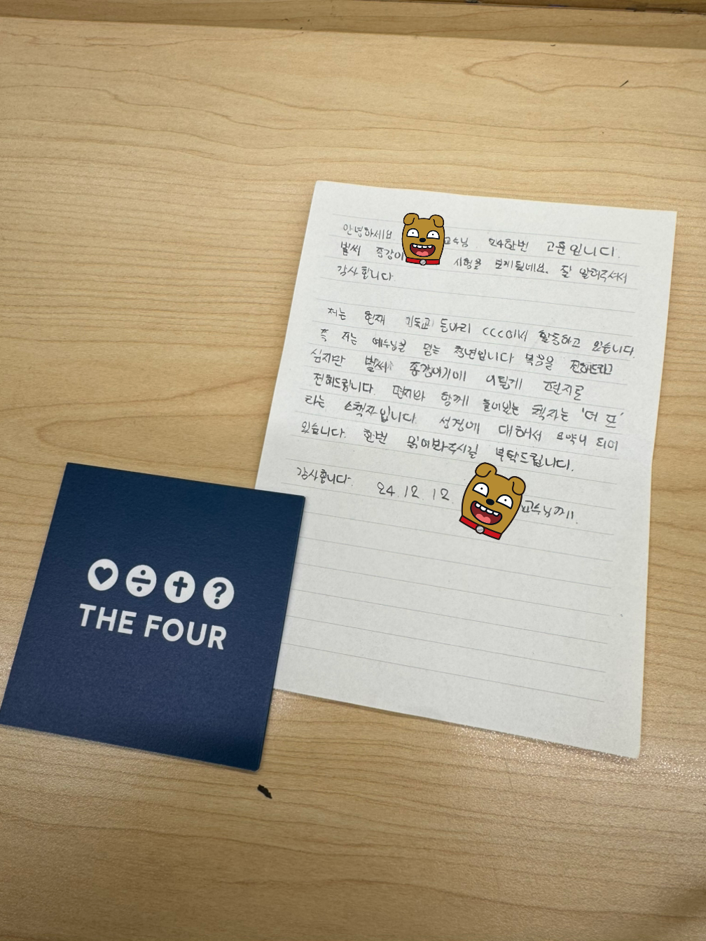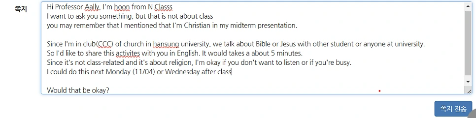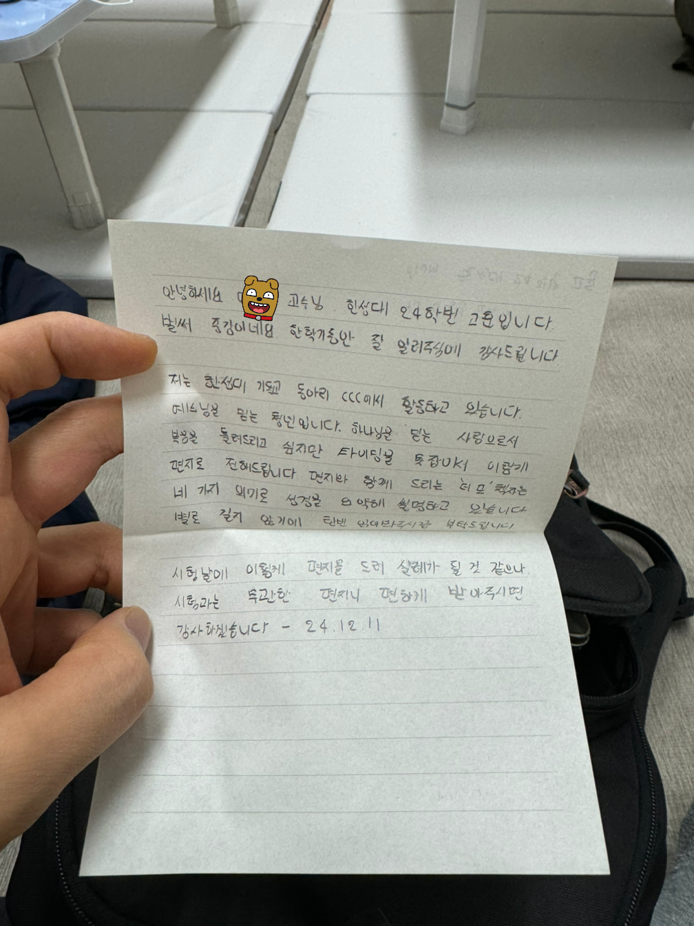 기독교 동아리 방에다 편지를 갔다 두었고, 막막할 것 같아서 내가 직접 쓴 편지 예시를 보여주었다.