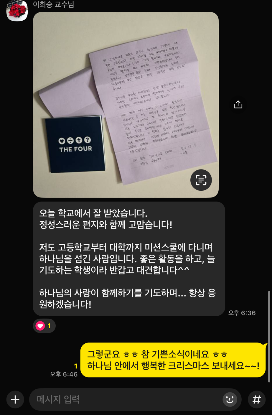 한성 이마기난스라는 수업을 해주신 교수님께 드린 편지다. 이 교수님과는 수업시간에도 친했고 그래서인지 더욱 복음을 전하고 싶었다. 복음을 전하려면 그전에 친한 관계를 유지하는 것이 좋다.