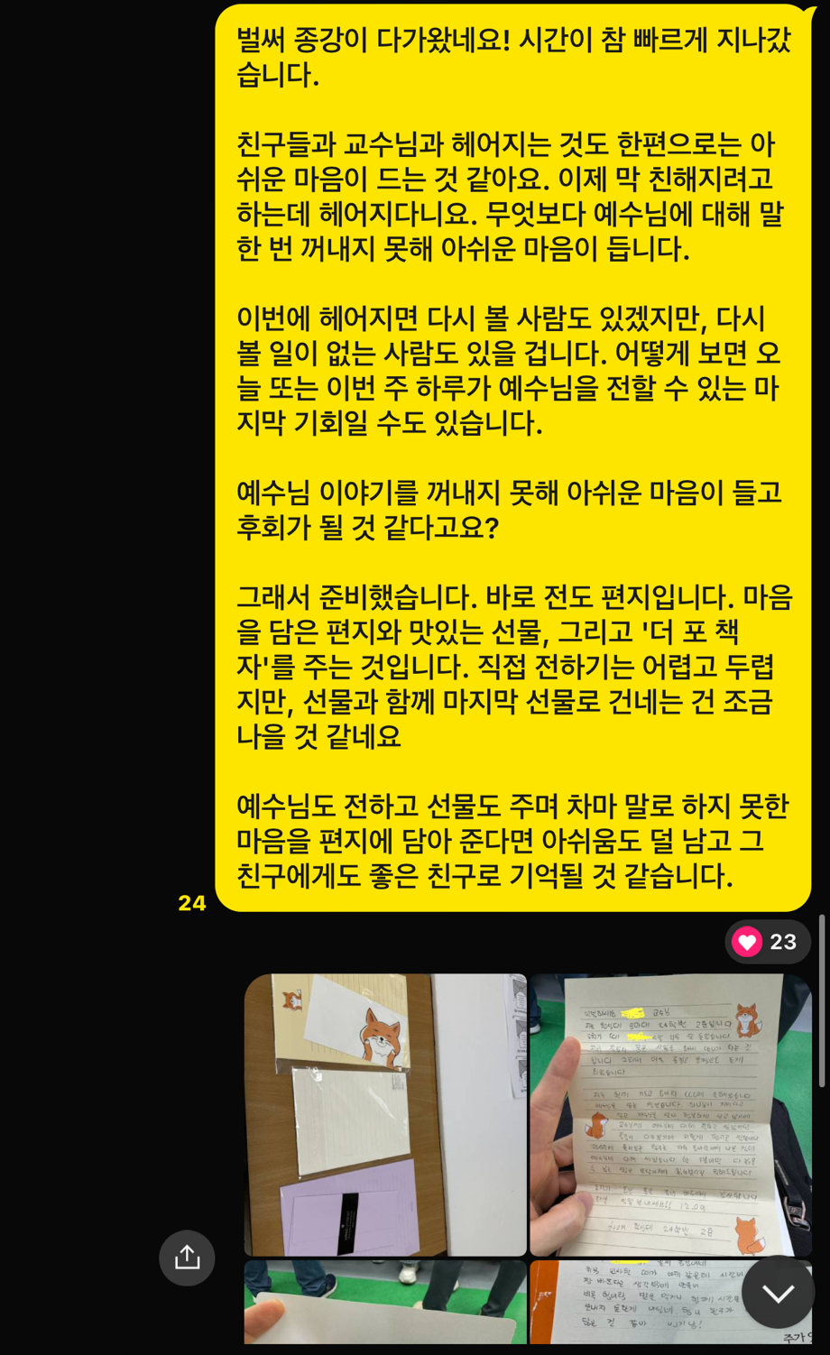 나는 이 전도의 좋은 방법을 혼자서만 아는 것은 아깝다고 생각했다. 학교에 얼마나 많은 학생과 교수님들이 계신가. 직접 전도하긴 사람들은 분명히 있다. 그런 사람들에게 편지가 전도의 좋은 도구가 될 것이라 생각했다.