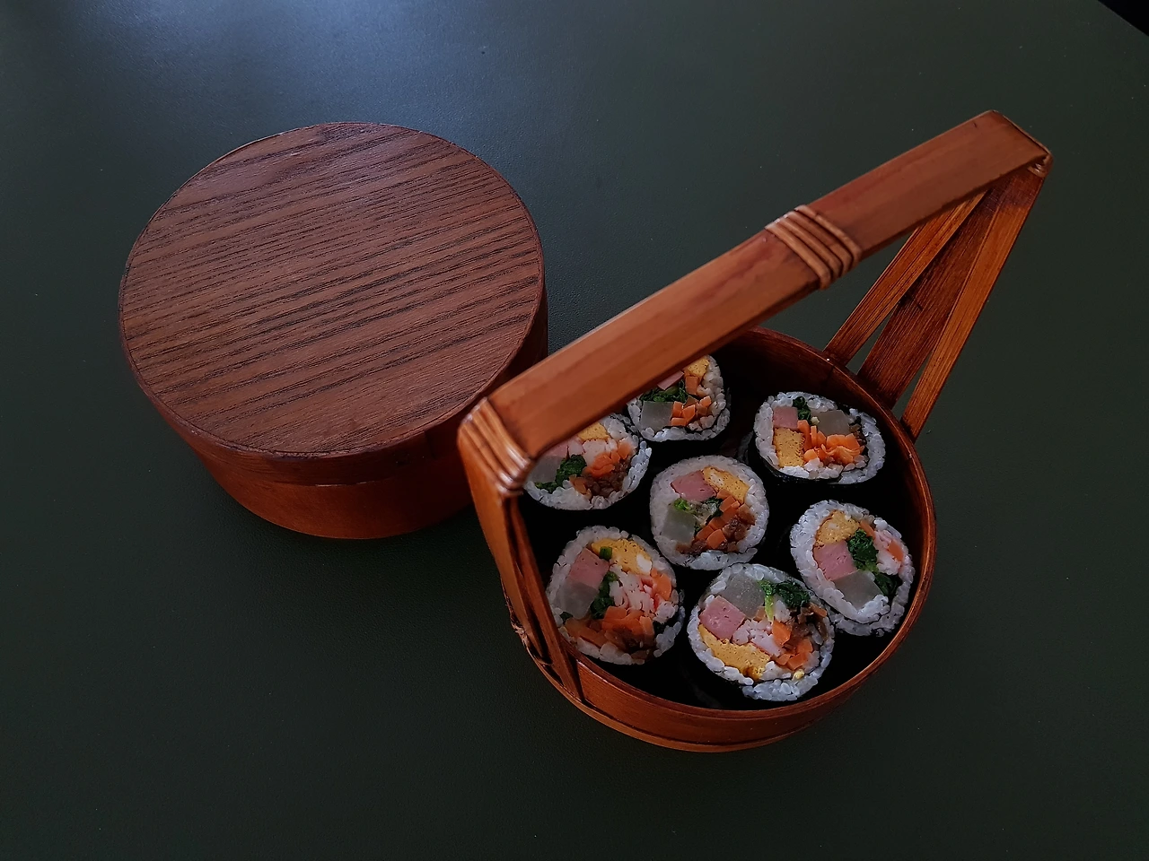 아무리 그래도 집에서 싼 김밥 도시락이 집밥이 아니라고 하는 건 너무하지. 요즘처럼 동네마다 김밥 집이 즐비하고 도시락 배달 업체가 넘쳐나는 세상에서 집에서 싼 도시락과 사 온 도시락은 구별해줘야 하잖아. 그래서 엄마는 집에서 싼 집밥 김밥은 집에서 먹든 들고나가 먹든 집밥에 포함시켜야 한다고 생각하고, 더 나아가 도시락으로 싸가지고 나가는 김밥은 집밥의 꽃이 아닐까 싶기도 해. 집에서 만든 음식인데 대충 차려 식구끼리 편하게 먹는 것이 아니라 솜씨를 부려 만들고 예쁘게 담아 가지고 나가서 서로 바꿔 먹기도 하잖아. 그렇다고 잔치음식처럼 대놓고 생색내는 건 아니고 은근히 집밥을 내보이며 자랑하는 거지. 그냥 집에서 먹는 대로 싸왔어~