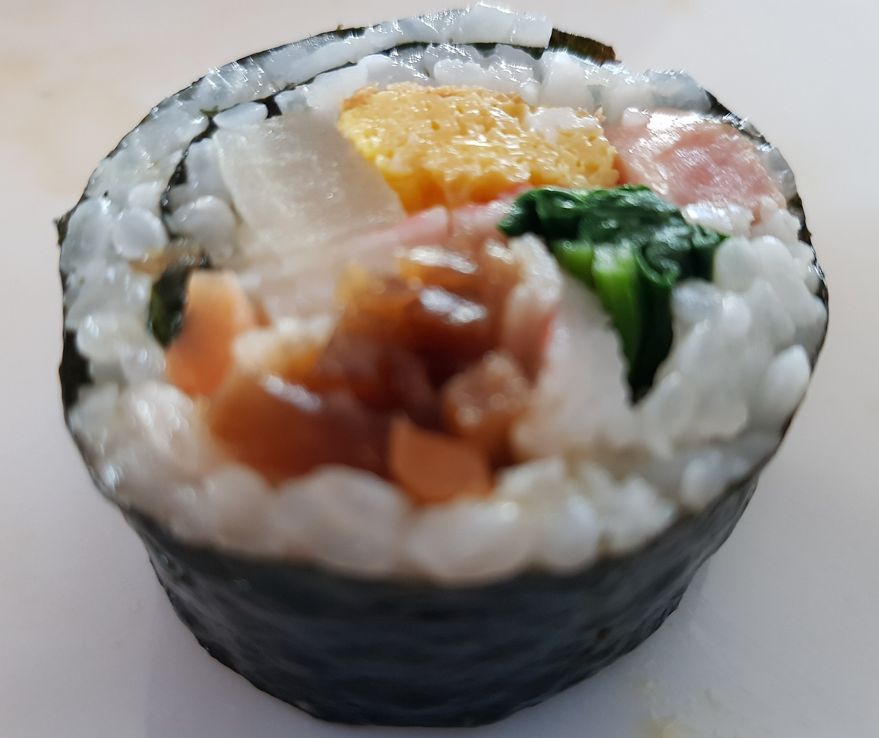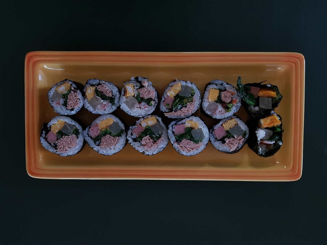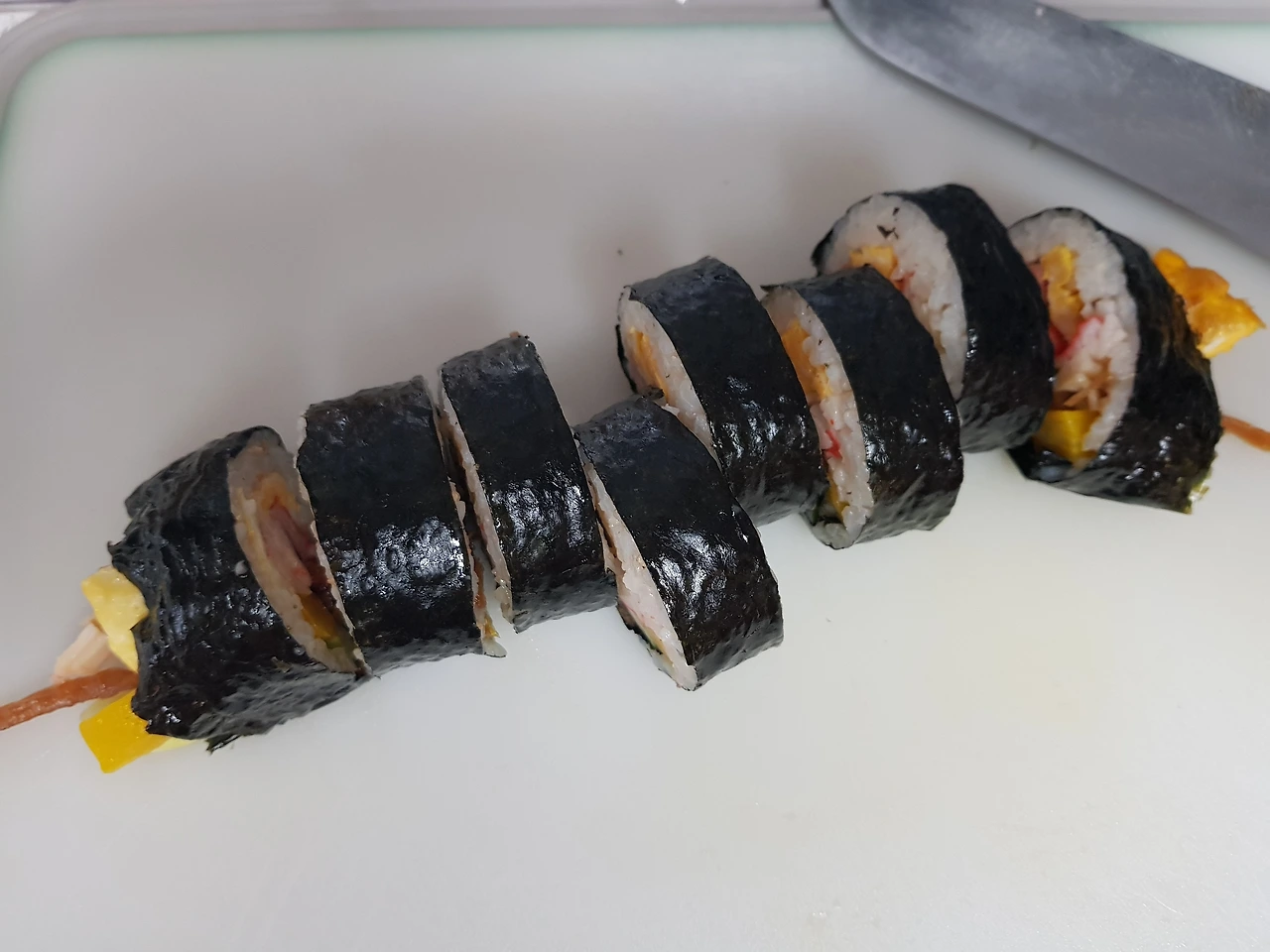 김발을 처음 써보면 도대체 이걸 어쩌라는 건지 감이 안 잡혀 김발까지 같이 말아 버릴 수도 있어. 한 바퀴 돌아서 김과 밥이 붙기 시작할 때 재빨리 김발을 빼내야 하는데, 어려우면 그냥 손으로 대충 말아 놓은 다음 김발에 싸서 다시 골고루 눌러서 제대로 붙여줘도 돼.