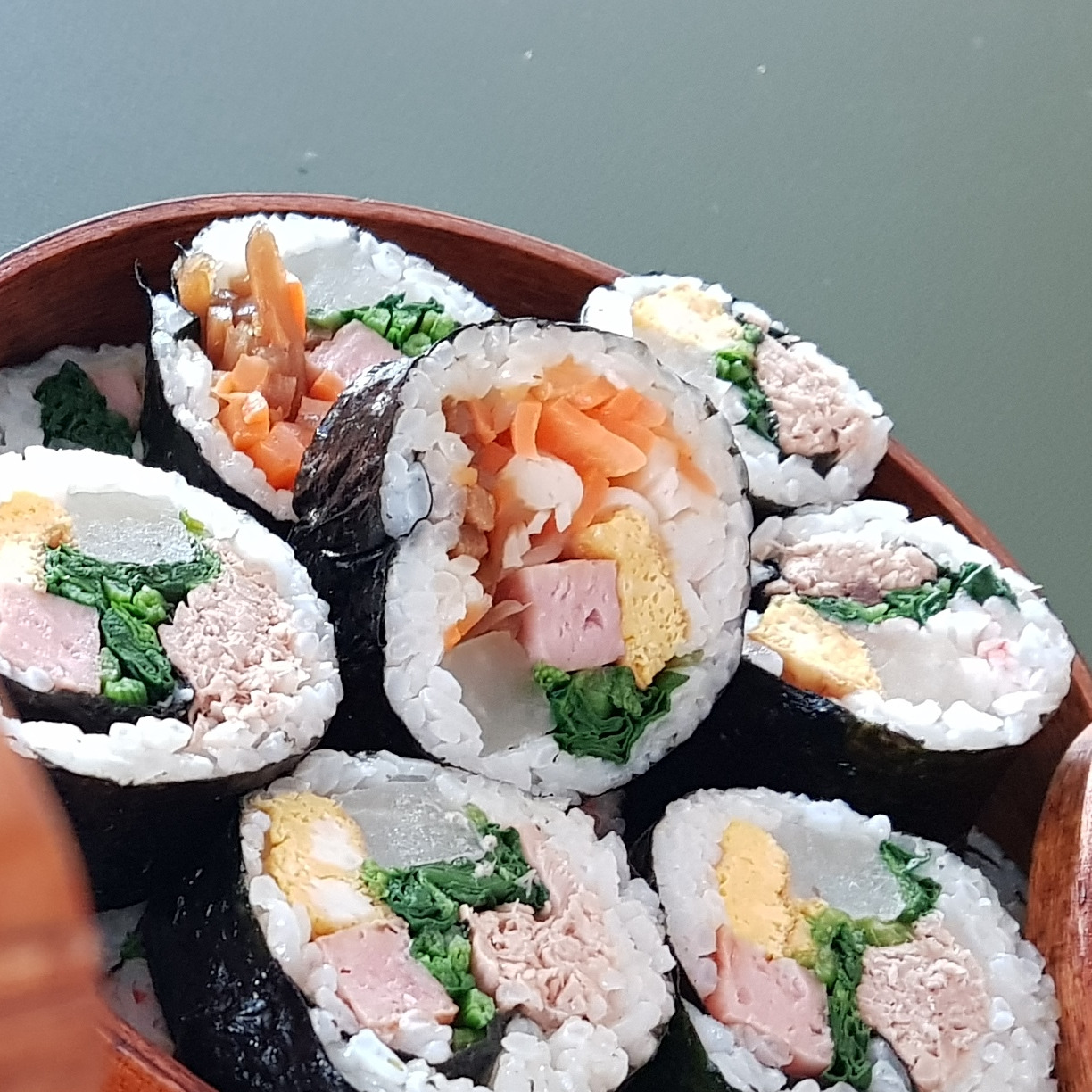 여기까지는 기본 재료고 우리 집에서 많이 해 먹던 참치김밥이나 치즈김밥을 만들려면 참치, 마요네즈, 깻잎, 슬라이스 치즈 정도가 더 있으면 돼.