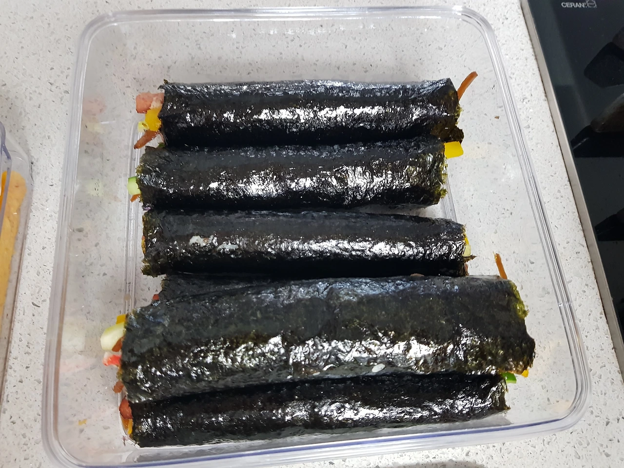 이제 재료 준비는 끝났으니 김밥을 싸 보자. 아! 김이 빠졌네. 김밥용 구운 김은 비슷비슷한 것 같더라고. 그냥 적당히 골라서 사 오면 되고 보관할 때만 냄새, 습기 안 들어가도록 조심하면 돼.