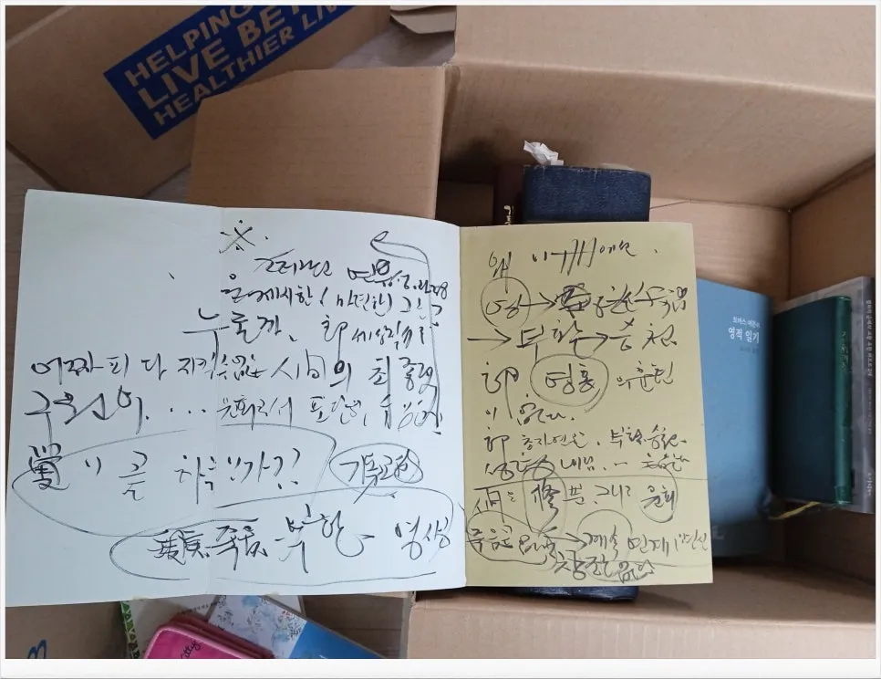 머리맡에 두고 주무시던 그림도구들과 책들... 잠에서 깨면 글을 쓰시고 그림을 그리셨다