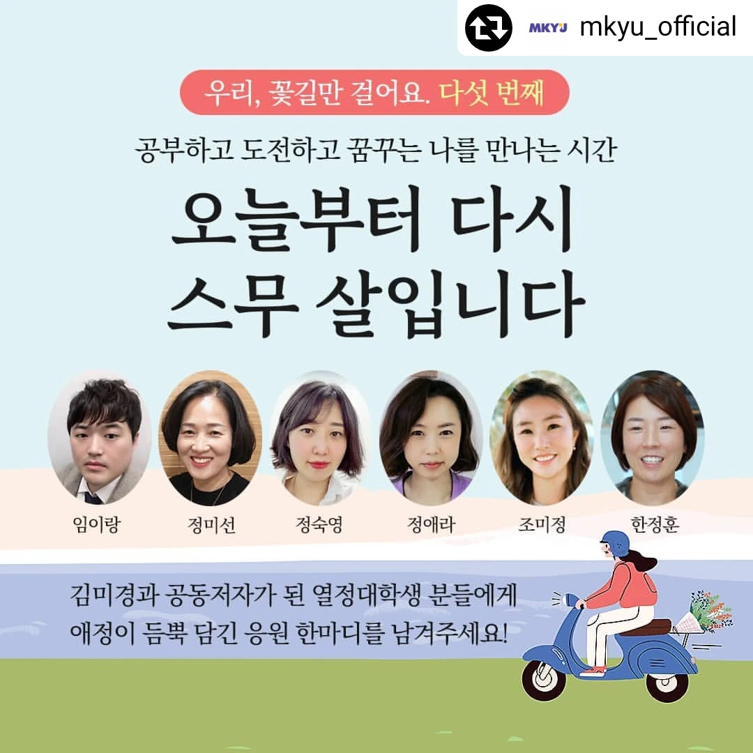 우연히 강의도 몇 번 보았고 리부트를 보고 더욱 좋아하는 작가이자 미경대학의 학장님과 책을 출판할 수 있게 되는 기회라니 게시글을 보자 매우 설레였다. 노트북 앞에 썼다가 지웠다가를 반복했다. 나의 1호 독자 아내에게 검사를 받은 후 응모를 했다.