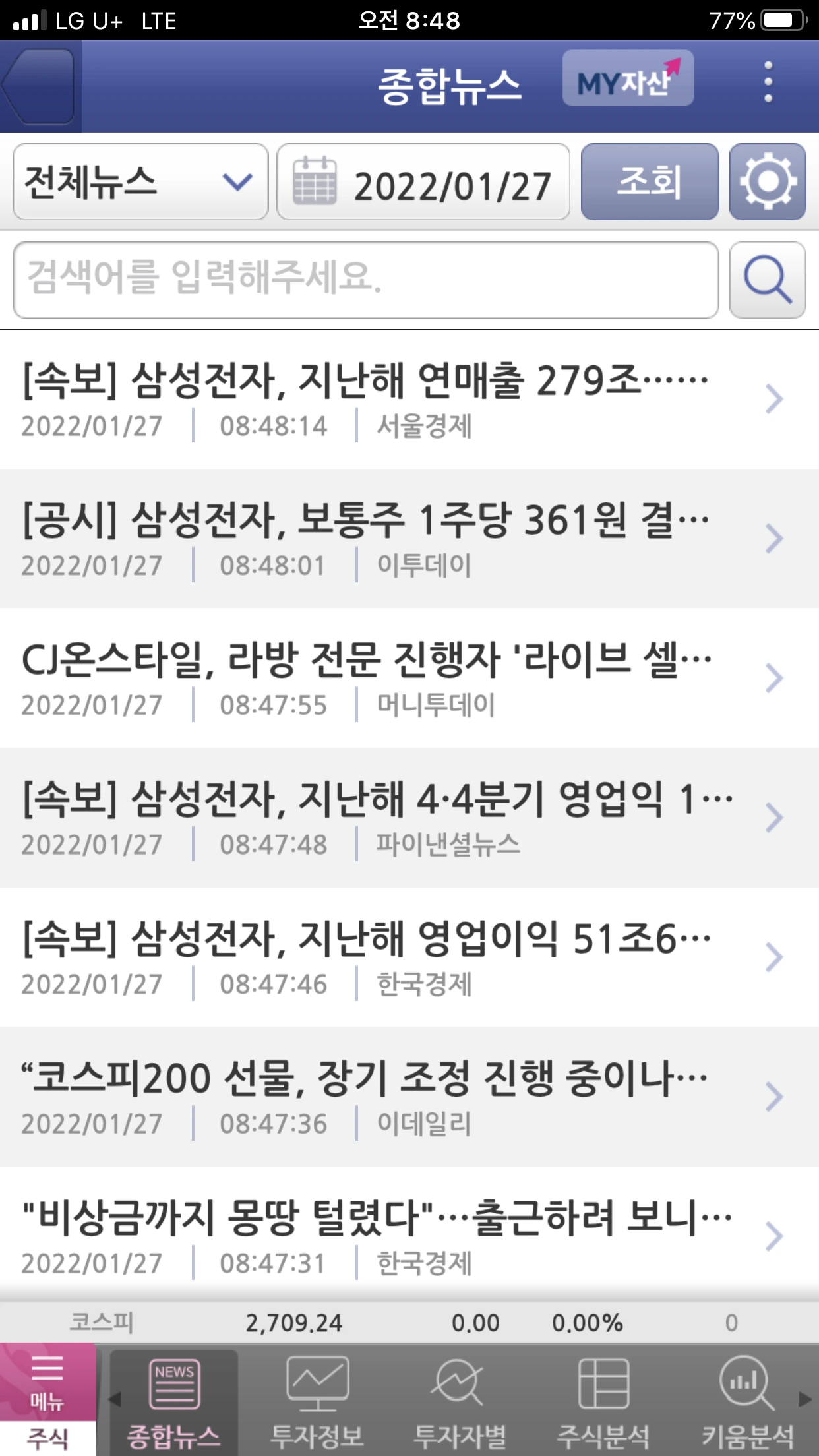 이제 MTS(모바일 거래 시스템)도 설치하고 계좌 연동하고 공부 중입니다. 설이 지난 뒤 시작해야겠다고 생각했습니다. 1월은 하락장이(지수가 전체적으로 떨어지는 시장) 지속되고 있어 다들 손실을 많이 보고 있습니다. 현금 보유가 현명하다는 판단이 들기도 했습니다.