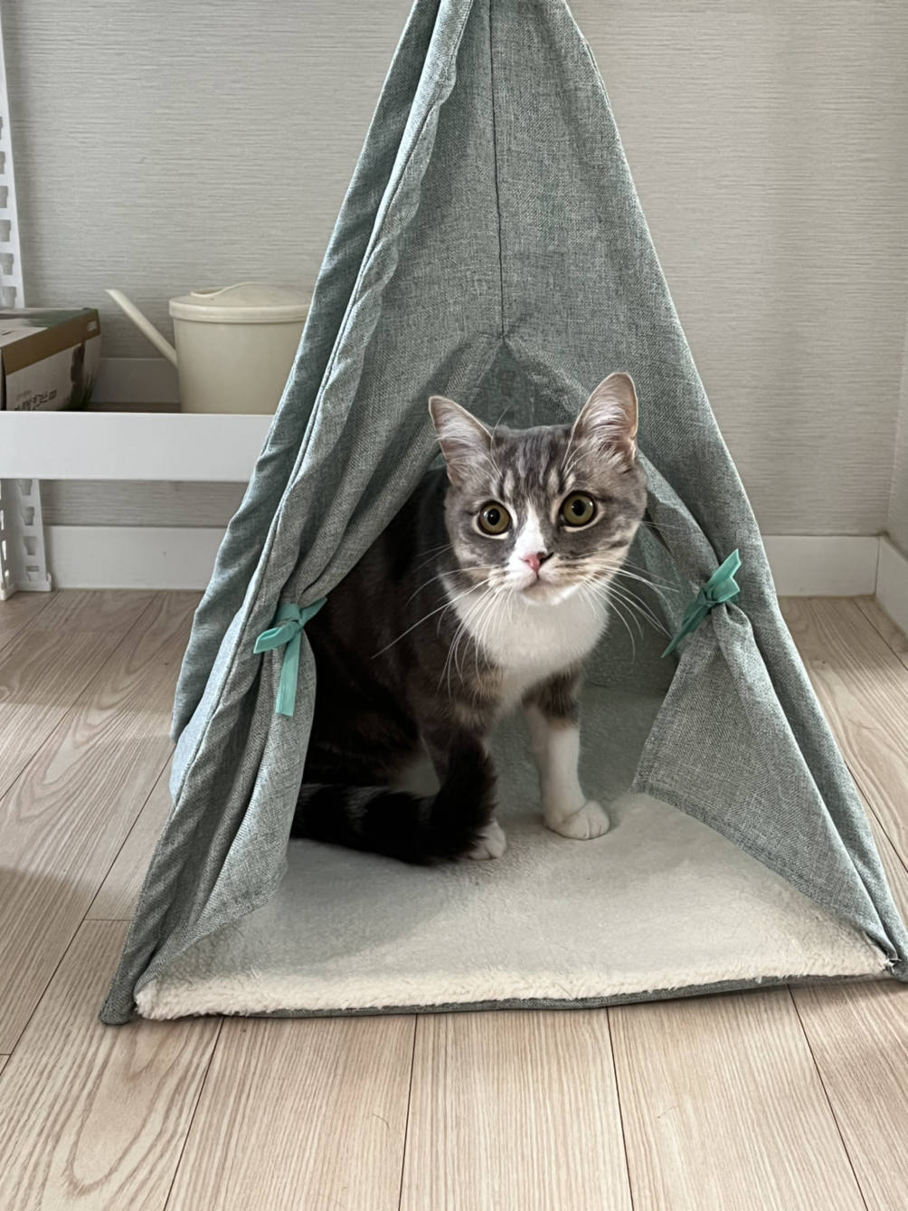 방문 앞에 숨숨집을 하나 더 배치했습니다. 조립하고 배치하기도 전에 자신의 것이라고 주장이라도 하는 듯 들어가서 자리를 잡습니다. 집 곳곳에 시엘이가 숨거나 자리를 잡을 수 있도록 배치를 했습니다. 스크래치도 캣타워에 있지만 추가해주고 싶었는데 다이소에서 기둥형 스크래치가 있어 장만했습니다.