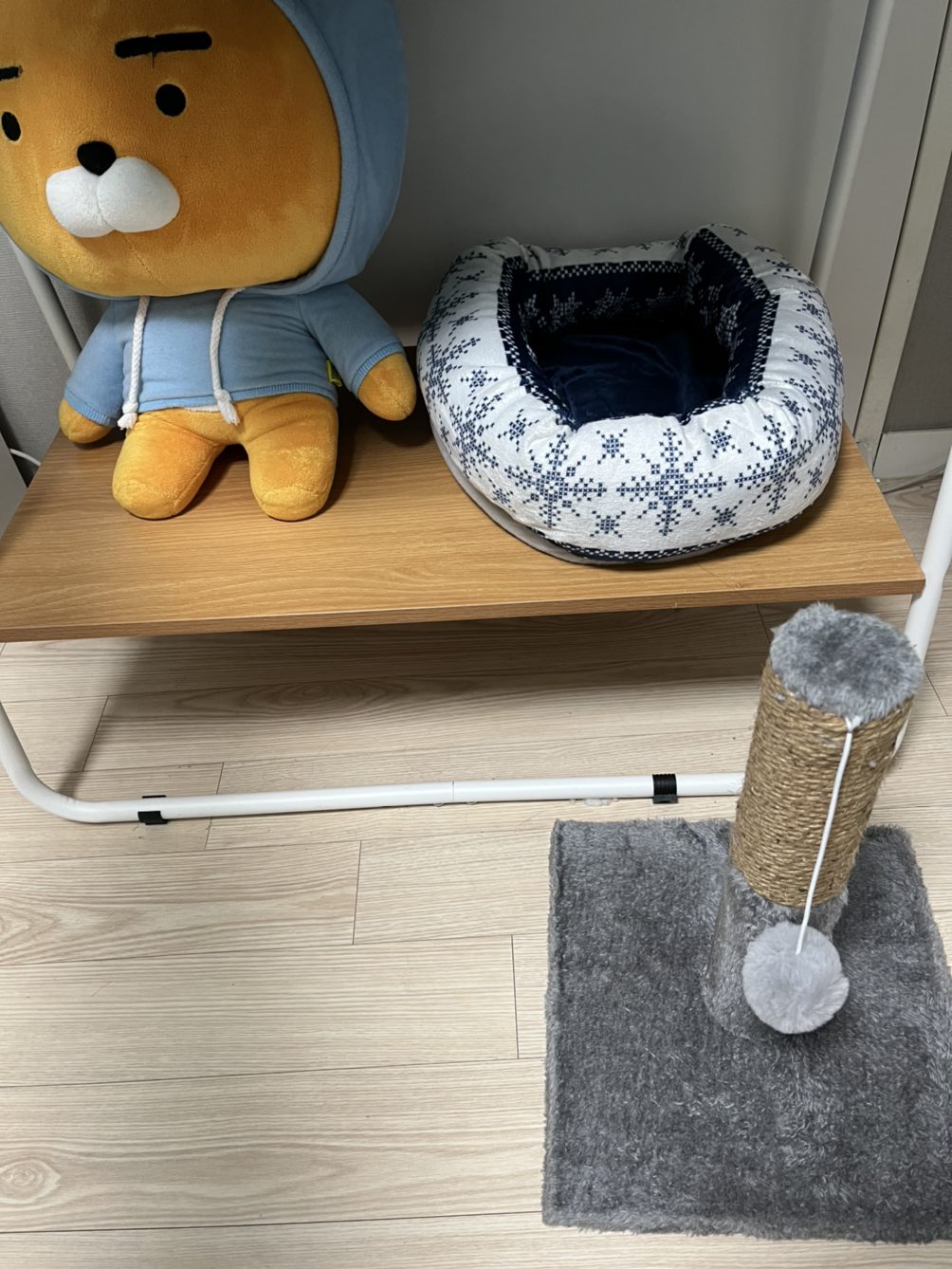 아내는 적응해서 괜찮았는데 생각해보니 위치를 바꿔야겠다며 가구 배치를 바꾸었습니다. 침대를 구석으로 옮기고 침대 옆에 나무 선반을 배치해서 캣타워로 진입하는 통로에 선반을 받침대 삼도록 바꾸었습니다. 나무 선반의 가시가 시엘이 발바닥에 혹시 박힐까 봐 통로에 깔개를 두었습니다.