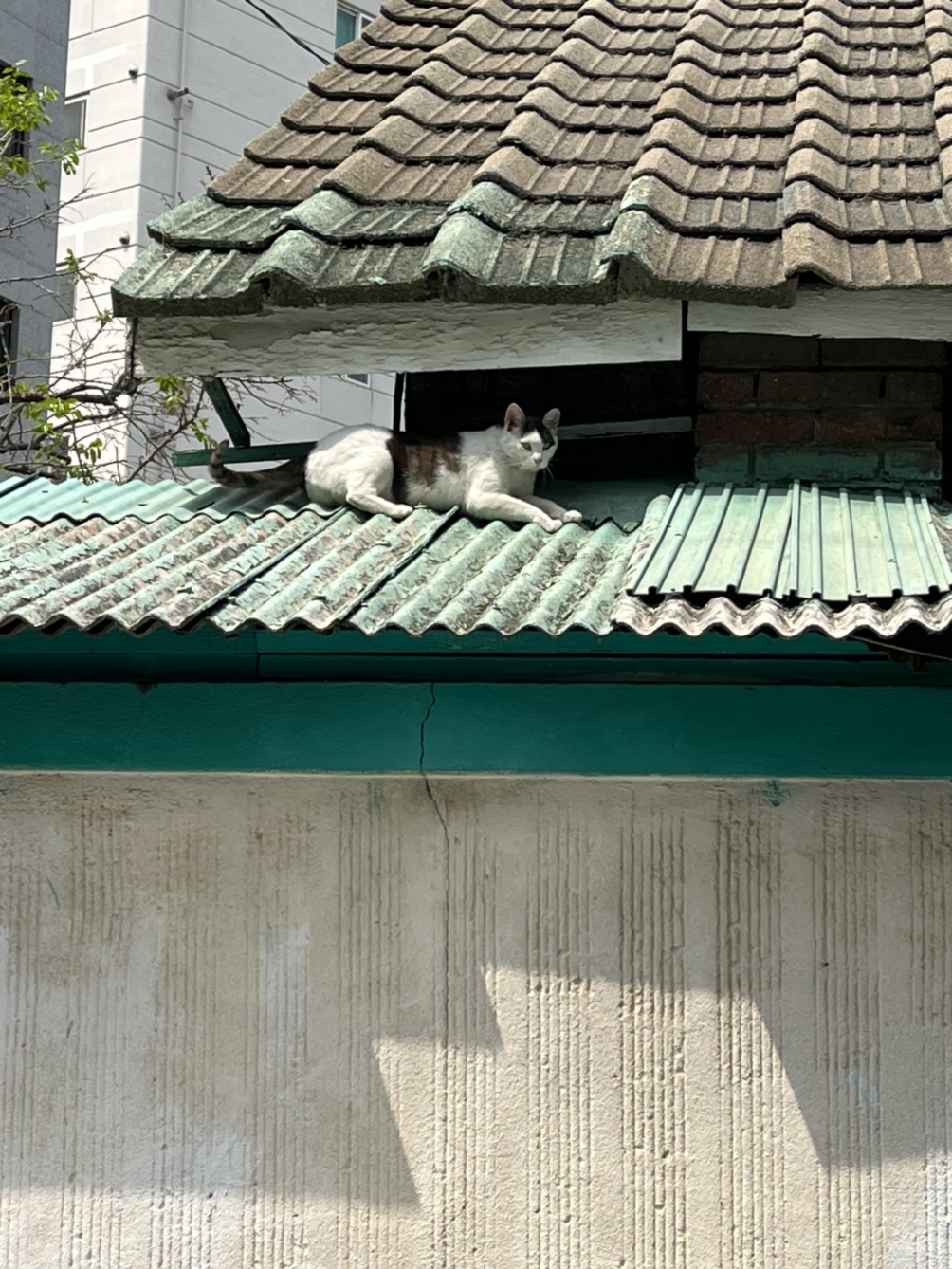 지붕 한 켠에 자리 잡고 햇빛을 쬐는 고양이는 사람의 시선에 아랑곳하지 않습니다. 봄은 고양이라는 말이 문득 떠오릅니다.