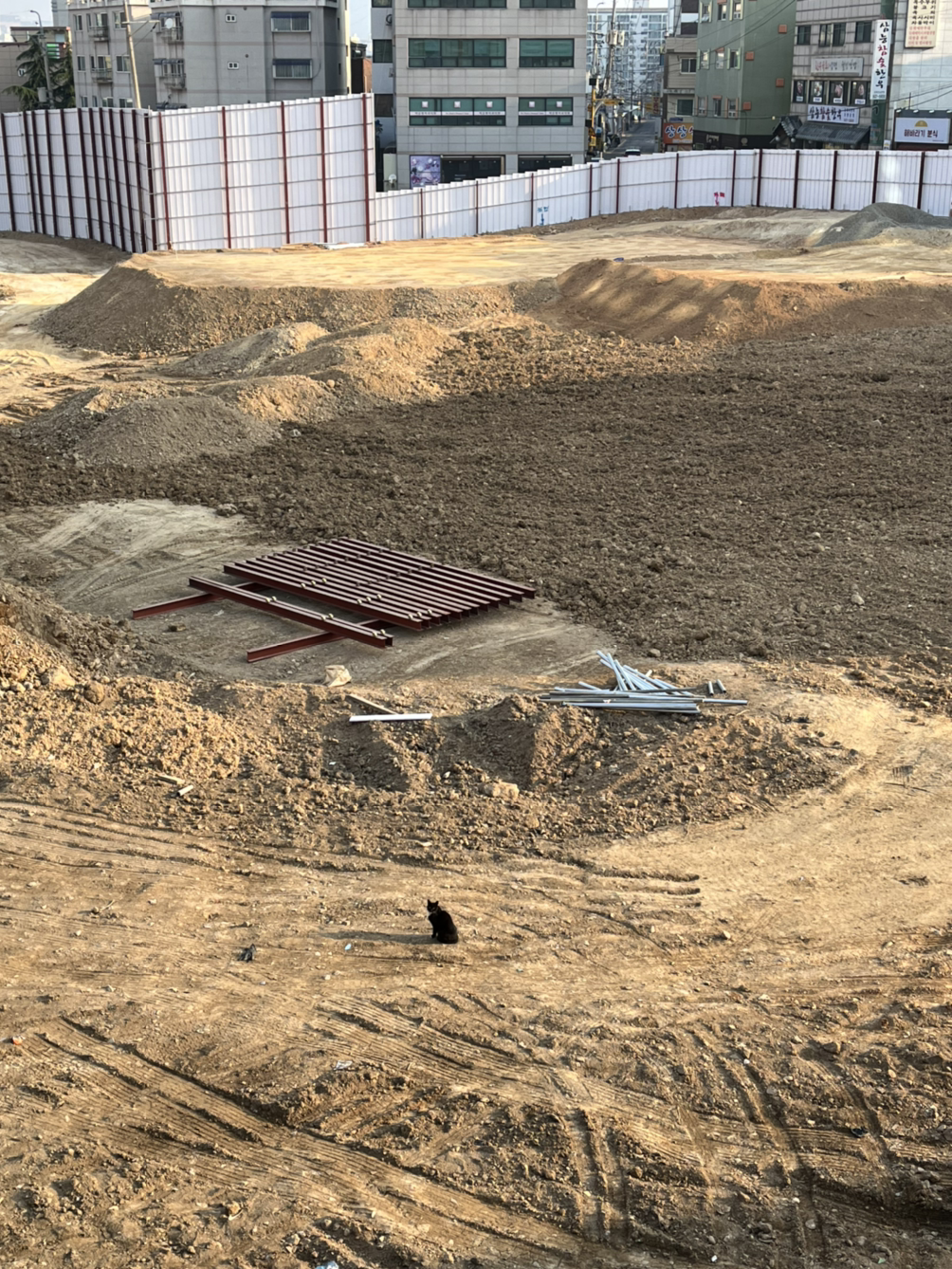 공사장에 아무것도 없는데 고양이 혼자 덩그러니 있는 모습을 보고 예전 살던 집 터는 아니었는지 집에서 키우던 고양이들이 밖에서 어떻게 살라고 놓고 간 건지 안타까운 마음입니다.