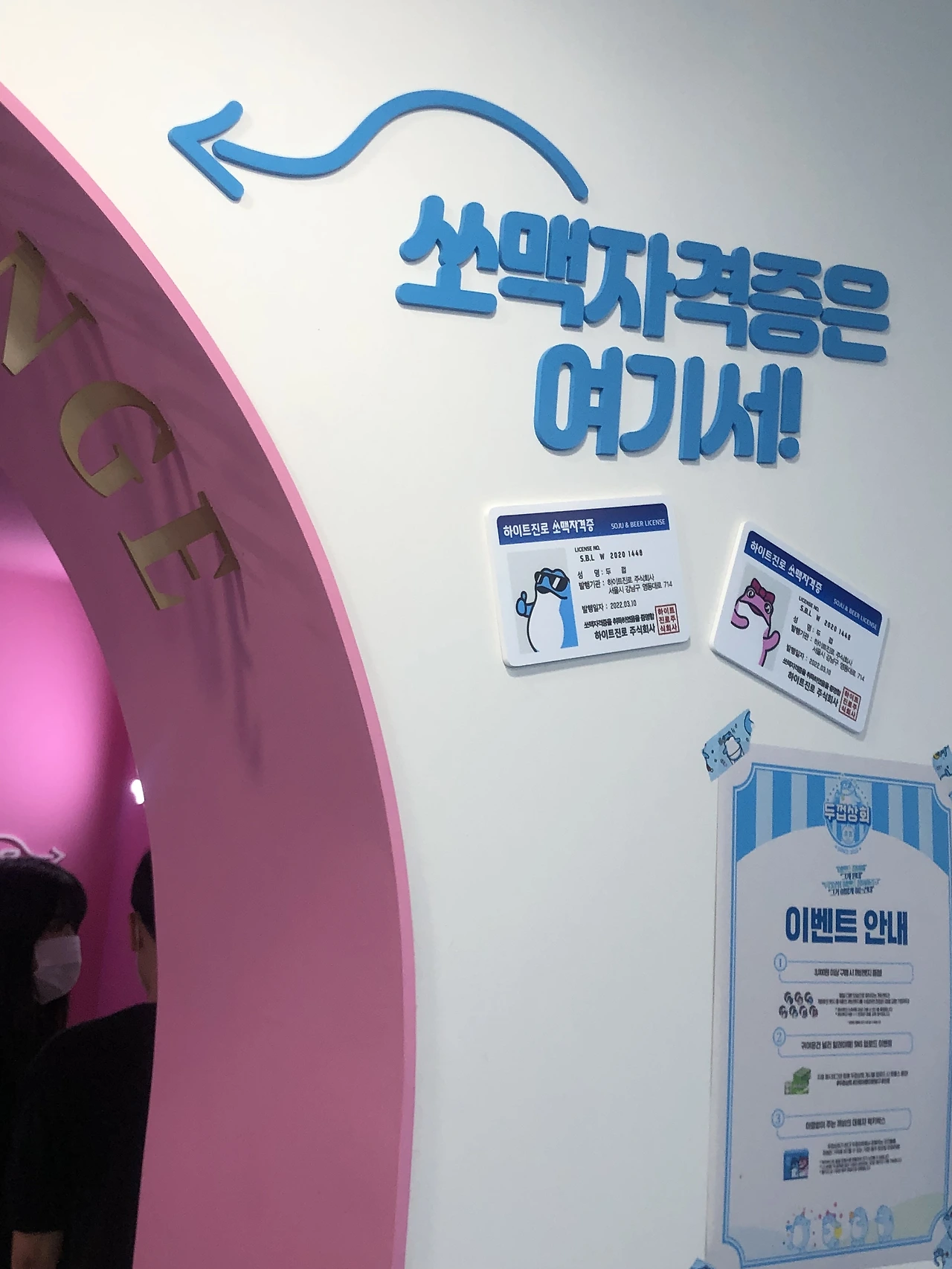 스티커 사진을 찍고 쏘맥 자격증도 발급받았습니다. 긴 행렬이었지만 이색적이었습니다. 아내는 사진을 찍게 될 줄 몰라서 꾸미지 않고 와서 아쉽다며 다음에 다시 오자고 했습니다. 낮에 오면 학생들 많은 거 아닐까 생각했는데 아내 말로는 미성년자 출입금지라고 했습니다. 미성년자에게 주류를 권장한다는 이미지를 피하기 위해서겠죠.