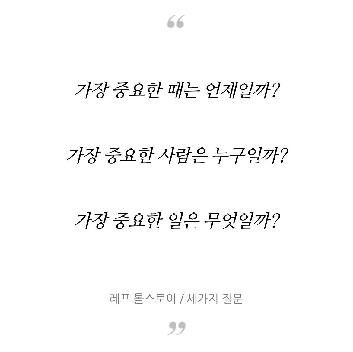 시간이 지나며 소중한 것들은 변해갔습니다. 장난감, 독서, 농구, 연예인, 음악, 게임 등 관심사도 바뀌고 삶에 대한 태도도 성격도 달라졌습니다. 생각의 흐름을 따라가다 보니 문득 톨스토이의 세 가지 질문이 떠올랐습니다. 스스로 묻고 답하는 시간을 가져 봅니다.