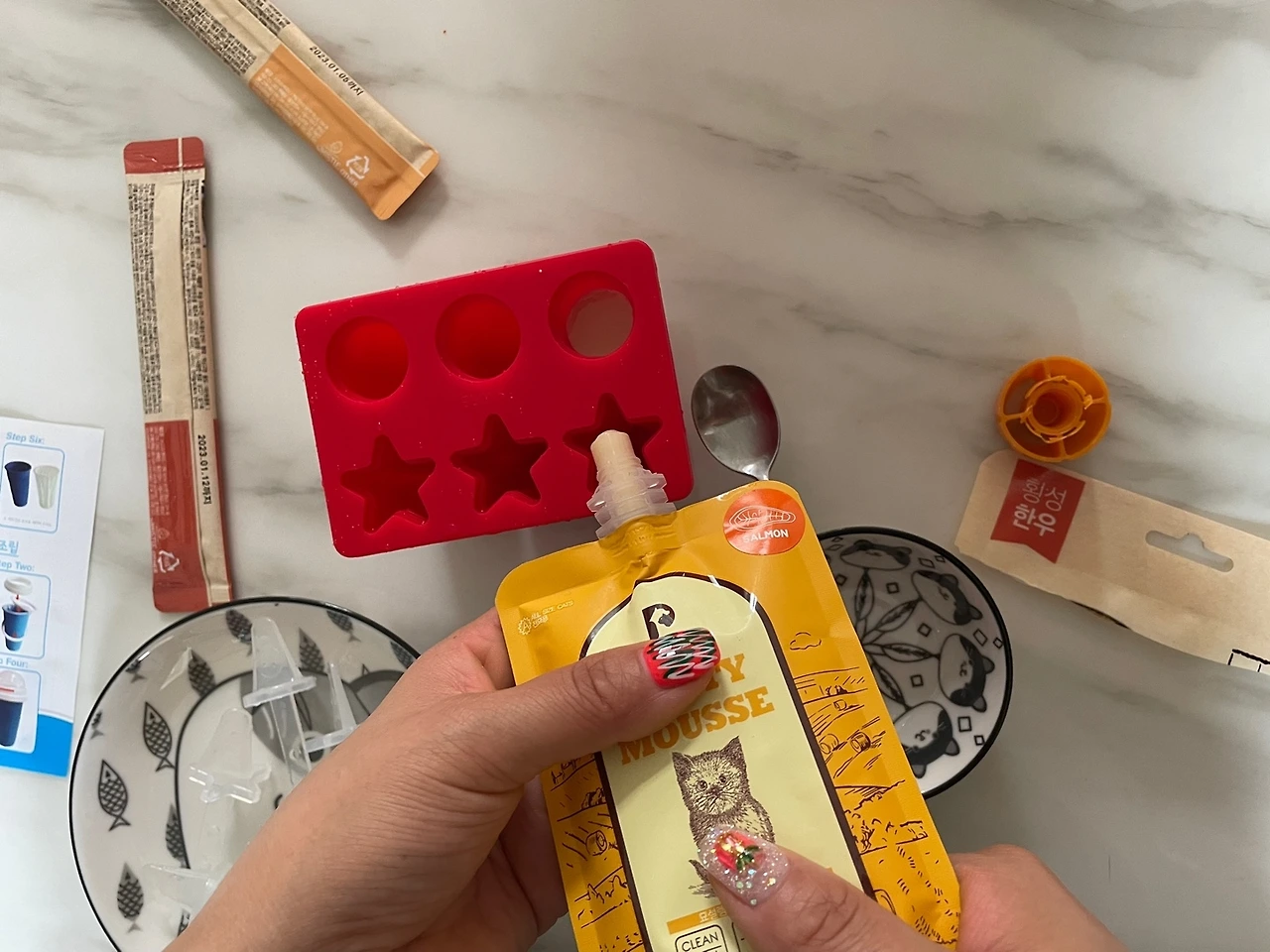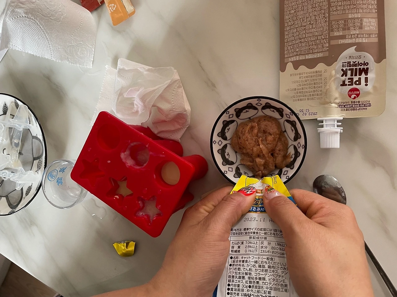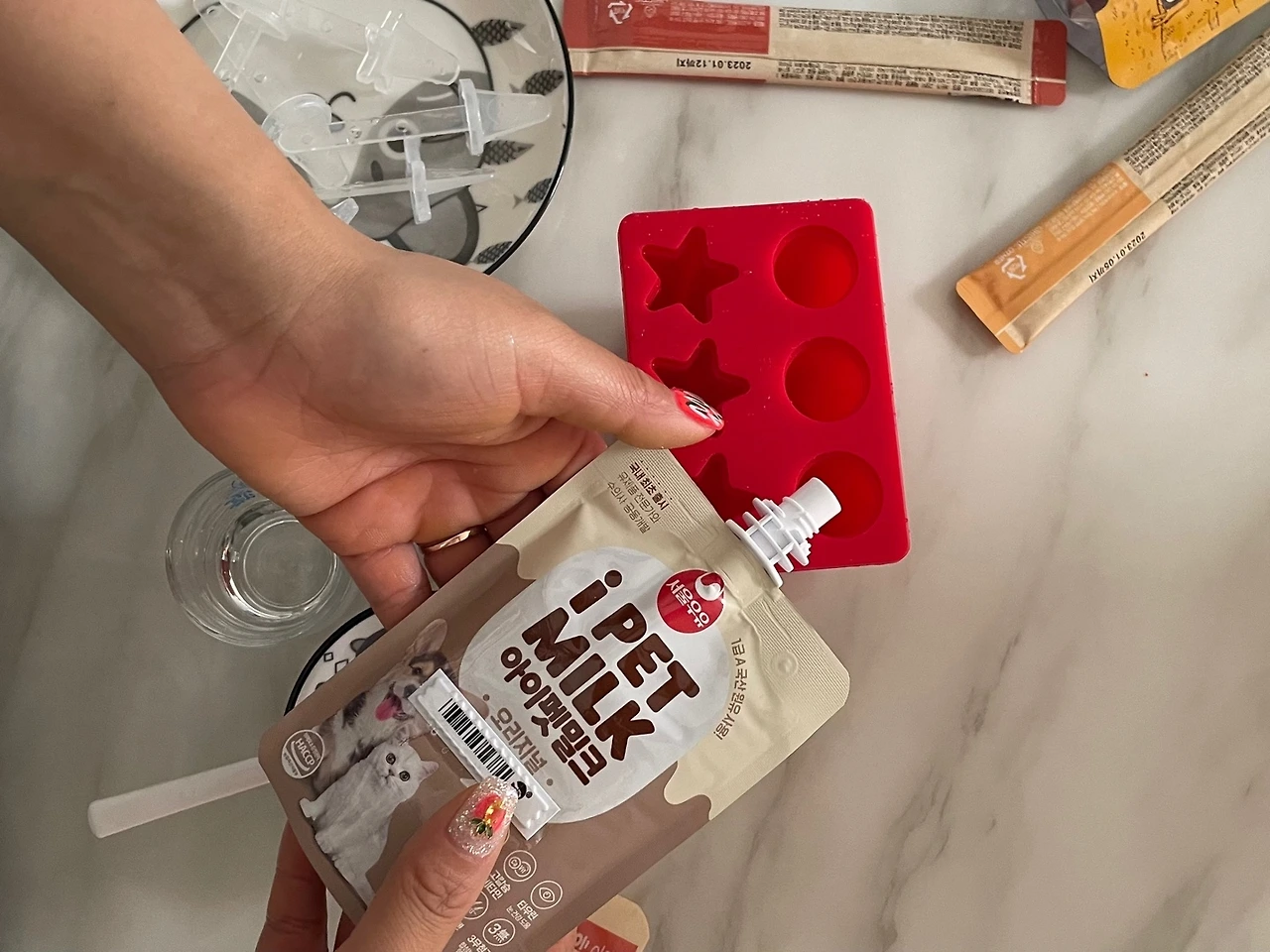 실행력이 금메달급인 아내는 바로 재료를 준비합니다. 종류별 펫 밀크, 츄르에 물을 조금 섞어서 틀에 넣고 얼립니다. 시엘이가 맛있게 먹을 거라고 기대하며