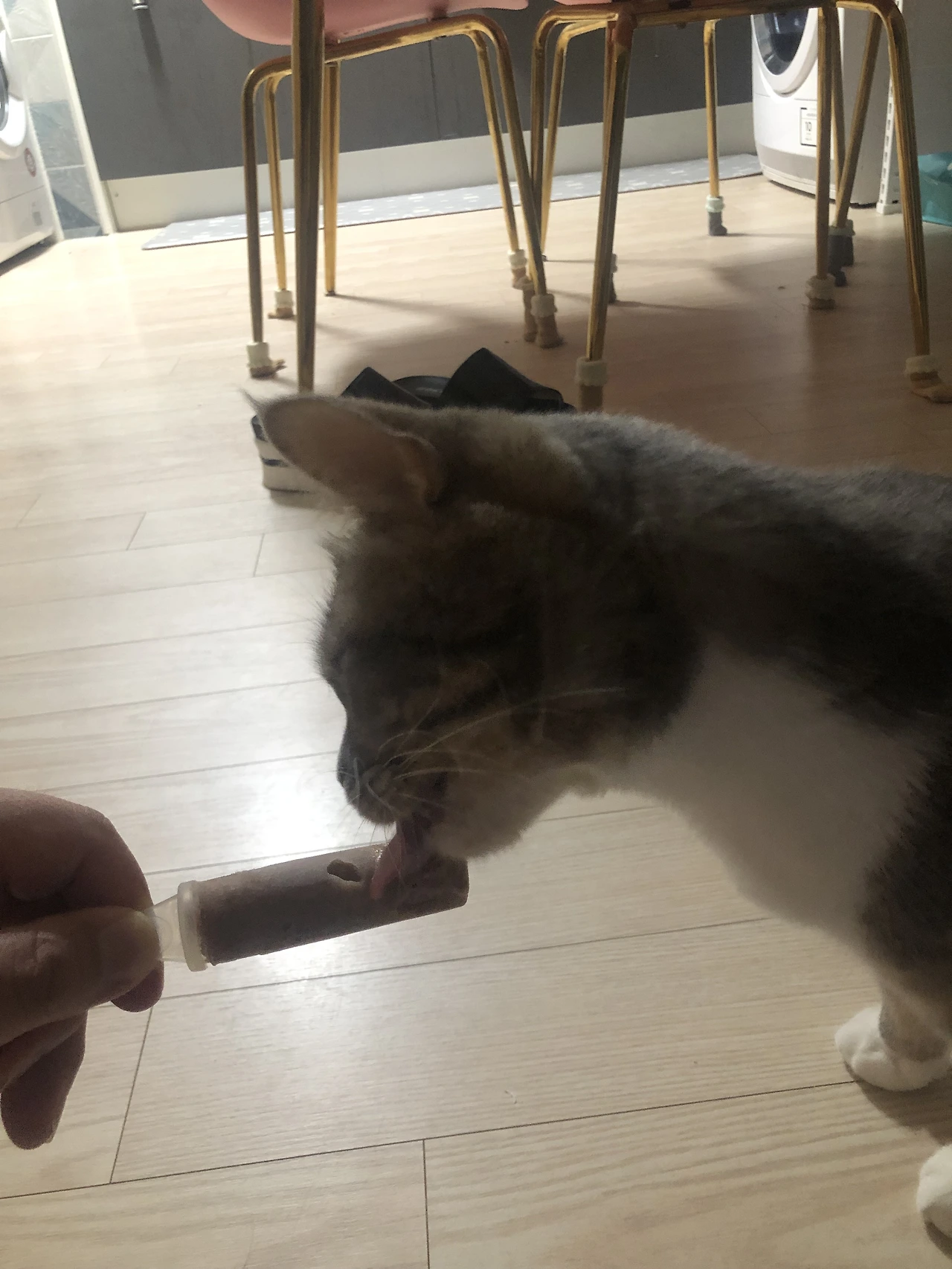 아이스크림은 실패하고 츄르만 조공하였습니다. 처음이라 생소해서 그런가 싶어서 아이스크림 위에 츄르를 발라주었는데 츄르만 먹고 끝이었습니다.