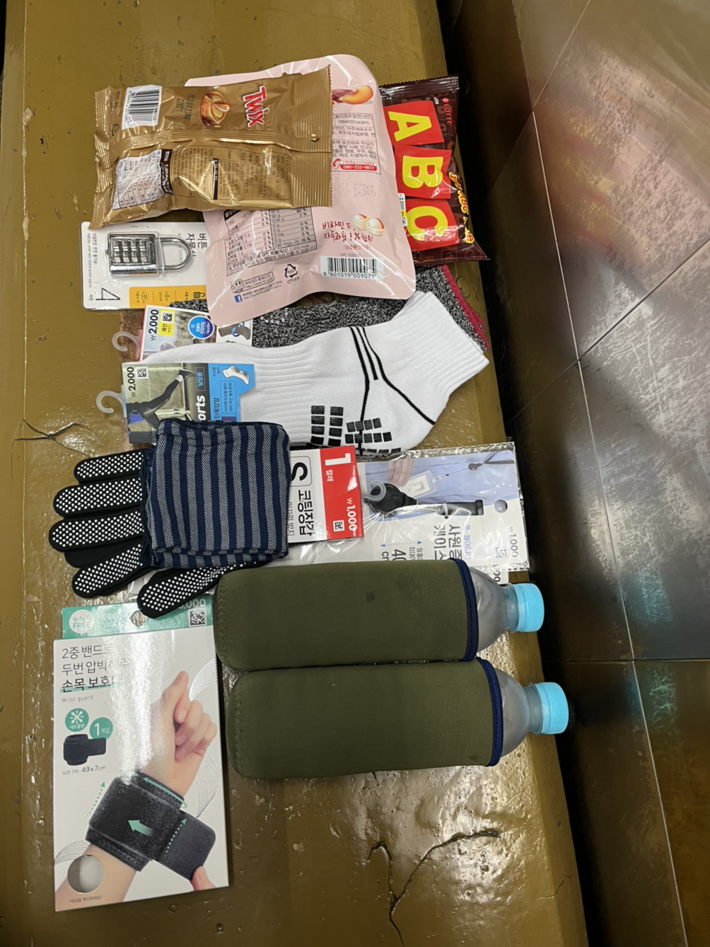 사원 줄은 출입카드를 주는데 일하기 위해 편한 트레이닝을 입어서 혹시라도 분실할까 준비했습니다. 쿠션이 있는 양말과 소지품을 사물함에 넣어두고 분실하지 않기 위해 자물쇠. 떨어진 당을 채우기 위해 초콜릿과 사탕을 샀습니다.